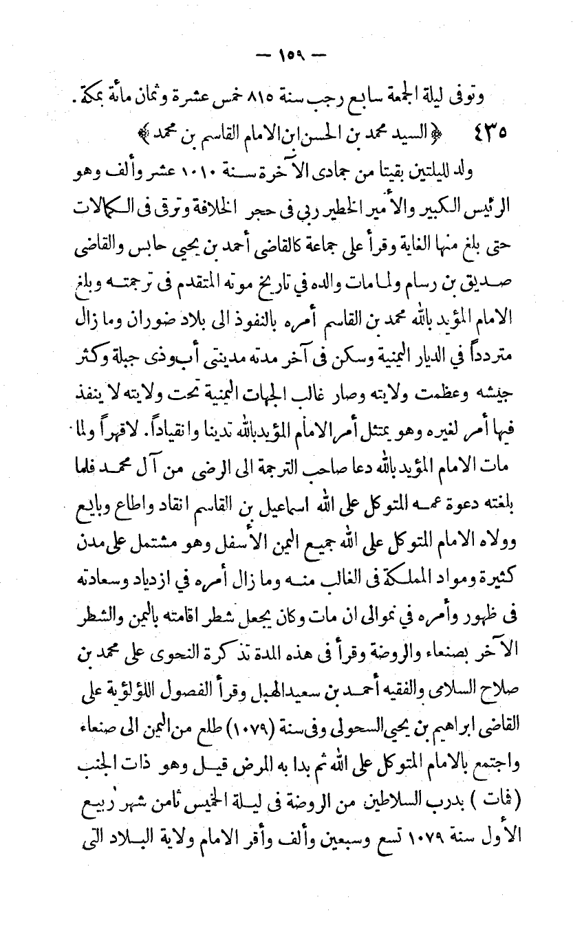 لَا قهرا وَلما مَاتَ الإِمَام الْمُؤَيد بِاللَّه دَعَا صَاحب التَّرْجَمَة إِلَى الرضي من آل مُحَمَّد فَلَمَّا بلغته دَعْوَة عَمه المتَوَكل على الله إِسْمَاعِيل بن الْقَاسِم انْقَادَ وأطاع وَبَايع وولاه الإِمَام المتَوَكل على الله جَمِيع الْيمن الْأَسْفَل وَهُوَ مُشْتَمل على مدن كَثِيرَة ومواد المملكة فِي الْغَالِب مِنْهُ وَمَا زَالَ أمره فِي ازدياد وسعادته فِي ظُهُور وَأمره فِي نمو إِلَى أن مَاتَ وَكَانَ يَجْعَل شطر إقامته بِالْيمن والشطر الآخر بِصَنْعَاء وَالرَّوْضَة وَقَرَأَ فِي هَذِه الْمدَّة تذكرة النحوي على مُحَمَّد بن صَلَاح السلامي والفقيه أَحْمد بن سعيد الهبل وَقَرَأَ الْفُصُول اللؤلؤية على القاضي إِبْرَاهِيم بن يحيى السحولي وَفِي سنة 1079 طلع من الْيمن إِلَى صنعاء وَاجْتمعَ بِالْإِمَامِ المتَوَكل على الله ثمَّ بدأ بِهِ الْمَرَض قيل وَهُوَ ذَات الْجنب فَمَاتَ بدرب السلاطين من الرَّوْضَة فِي لَيْلَة الْخَمِيس ثامن شهر ربيع الأول سنة 1079 تسع وَسبعين وَألف وَأقر الإِمَام ولَايَة الْبِلَاد الَّتِى