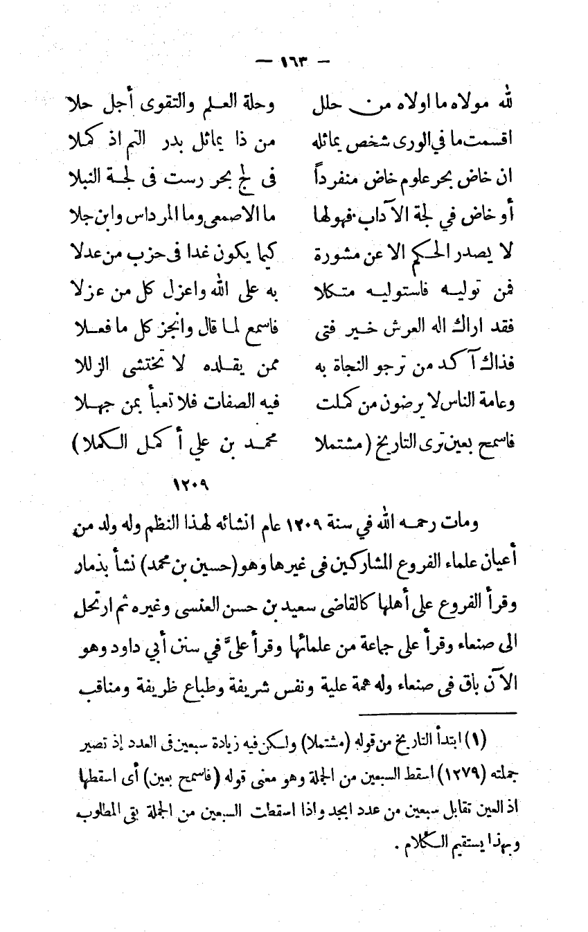 (فاسمح بِعَين ترى التَّارِيخ مُشْتَمِلًا ... مُحَمَّد بن عَليّ أكمل الكملا)