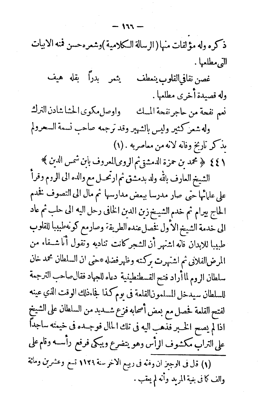 الشَّيْخ الْعَارِف بِاللَّه ولد بِدِمَشْق ثمَّ ارتحل مَعَ وَالِده إِلَى الروم وَقَرَأَ على علمائها حَتَّى صَار مدرسا بِبَعْض مدارسها ثمَّ مَال إِلَى التصوف فخدم الْحَاج بيرام ثمَّ خدم الشَّيْخ زين الدَّين الخافي رَحل إِلَيْهِ إِلَى حلب ثمَّ عَاد إِلَى خدمَة الشَّيْخ الأول فَحصل عِنْده الطَّرِيقَة وَصَارَ مَعَ كَونه طَبِيبا للقلوب طَبِيبا للأبدان فَإِنَّهُ اشْتهر أَن الشجر كَانَت تناديه وَتقول أَنا شِفَاء من الْمَرَض الفلاني ثمَّ اشتهرت بركته وَظهر فَضله حَتَّى إن السُّلْطَان مُحَمَّد خَان سُلْطَان الروم لما أَرَادَ فتح الْقُسْطَنْطِينِيَّة دَعَاهُ للْجِهَاد فَقَالَ صَاحب التَّرْجَمَة للسُّلْطَان سيدخل الْمُسلمُونَ القلعة فِي يَوْم كَذَا فجَاء ذَلِك الْوَقْت الَّذِي عينه لفتح القلعة فَحصل مَعَ بعض أَصْحَابه فزع شَدِيد من السُّلْطَان على الشَّيْخ إِذا لم يَصح الْخَبَر فَذهب إِلَيْهِ فِي تِلْكَ الْحَال فَوَجَدَهُ فِي خيمته سَاجِدا على التُّرَاب مَكْشُوف الرَّأْس وَهُوَ يتَضَرَّع ويبكي فَرفع رَأسه وَقَامَ على