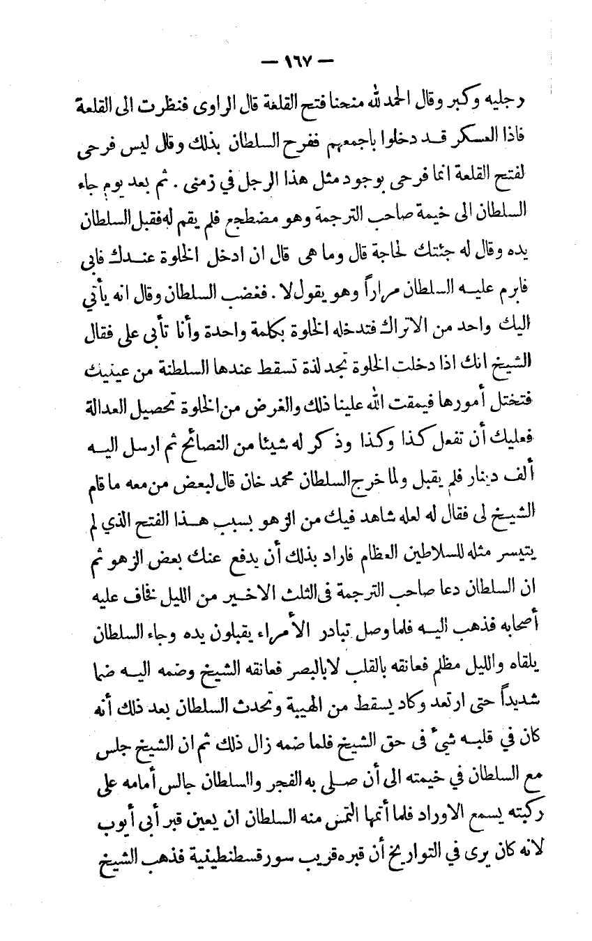 ثمَّ بعد يَوْم جَاءَ السُّلْطَان إِلَى خيمة صَاحب التَّرْجَمَة وَهُوَ مُضْطَجع فَلم يقم لَهُ فَقبل السُّلْطَان يَده وَقَالَ لَهُ جئْتُك لحَاجَة قَالَ وَمَا هي قَالَ أن أدخل الْخلْوَة عنْدك فَأبى فأبرم عَلَيْهِ السُّلْطَان مرَارًا وَهُوَ يَقُول لَا فَغَضب السُّلْطَان وَقَالَ إنه يَأْتِي إليك وَاحِد من الأتراك فتدخله الْخلْوَة بِكَلِمَة وَاحِدَة وَأَنا تأبى علي فَقَالَ الشَّيْخ إِنَّك إِذا دخلت الْخلْوَة تَجِد لَذَّة تسْقط عِنْدهَا السلطنة من عَيْنَيْك فتختل أمورها فيمقت الله علينا ذَلِك وَالْغَرَض من الْخلْوَة تَحْصِيل الْعَدَالَة فَعَلَيْك أَن تفعل كَذَا وَكَذَا وَذكر لَهُ شَيْئا من النصائح ثمَّ أرسل إِلَيْهِ ألف دِينَار فَلم يقبل وَلما خرج السُّلْطَان مُحَمَّد خَان قَالَ لبَعض من مَعَه مَا قَامَ الشَّيْخ لي فَقَالَ لَهُ لَعَلَّه شَاهد فِيك من الزهو بِسَبَب هَذَا الْفَتْح الَّذِي لم يَتَيَسَّر مثله للسلاطين الْعِظَام فَأَرَادَ بذلك أَن يدْفع عَنْك بعض الزهو ثمَّ إن السُّلْطَان دَعَا صَاحب التَّرْجَمَة فِي الثُّلُث الْأَخير من اللَّيْل فخاف عَلَيْهِ أَصْحَابه فَذهب إِلَيْهِ فَلَمَّا وصل تبادر الْأُمَرَاء يقبلُونَ يَده وَجَاء السُّلْطَان يلقاه وَاللَّيْل مظلم فعانقه بِالْقَلْبِ لَا بالبصر فعانقه الشَّيْخ وضمه إِلَيْهِ ضما شَدِيدا حَتَّى ارتعد وَكَاد يسْقط من الهيبة وتحدث السُّلْطَان بعد ذَلِك أَنه كَانَ فِي قلبه شئ فِي حق الشَّيْخ فَلَمَّا ضمه زَالَ ذَلِك ثمَّ إن الشَّيْخ جلس مَعَ السُّلْطَان فِي خيمته إِلَى أَن صلى بِهِ الْفجْر وَالسُّلْطَان جَالس أَمَامه على ركبته يسمع الأوراد فَلَمَّا أتمهَا التمس مِنْهُ السُّلْطَان أن يعين قبر أَبى أَيُّوب لِأَنَّهُ كَانَ يرى فِي التواريخ أَن قَبره قريب سور قسطنطينية فَذهب الشَّيْخ