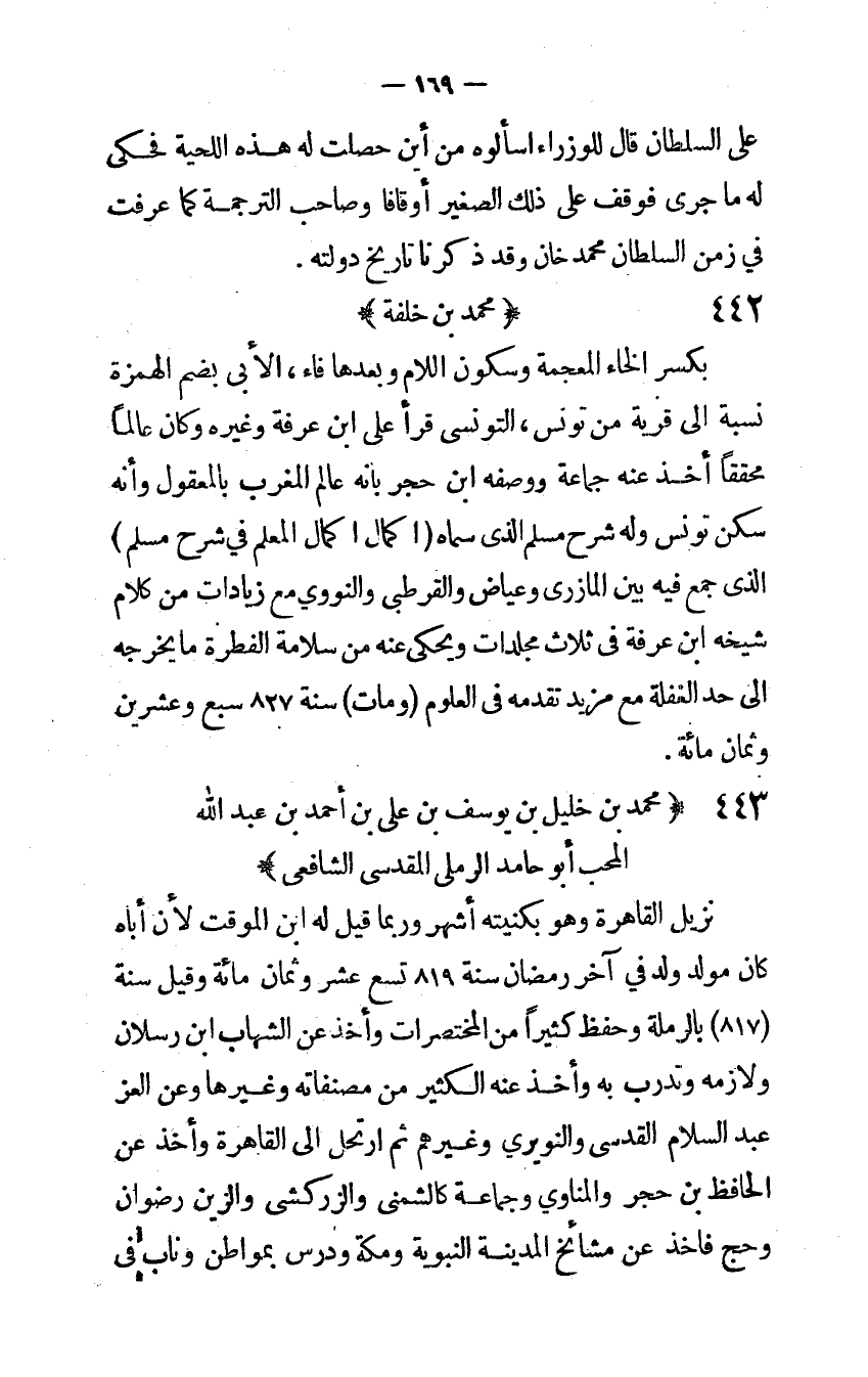 بِكَسْر الْخَاء الْمُعْجَمَة وَسُكُون اللَّام وَبعدهَا فَاء الأبي بِضَم الْهمزَة نِسْبَة إِلَى قَرْيَة من تونس التونسي قَرَأَ على ابْن عَرَفَة وَغَيره وَكَانَ عَالما محققا أَخذ عَنهُ جمَاعَة وَوَصفه ابْن حجر بِأَنَّهُ عَالم الْمغرب بالمعقول وَأَنه سكن تونس وَله شرح مُسلم الذي سَمَّاهُ إكمال إكمال الْمعلم فِي شرح مُسلم الذي جمع فِيهِ بَين المازري وعياض والقرطبي وَالنَّوَوِيّ مَعَ زيادات من كَلَام شَيْخه ابْن عَرَفَة فِي ثَلَاث مجلدات ويحكى عَنهُ من سَلامَة الْفطْرَة مَا يُخرجهُ إِلَى حد الْغَفْلَة مَعَ مزِيد تقدمه فِي الْعُلُوم وَمَات سنة 827 سبع وَعشْرين وثمان مائَة