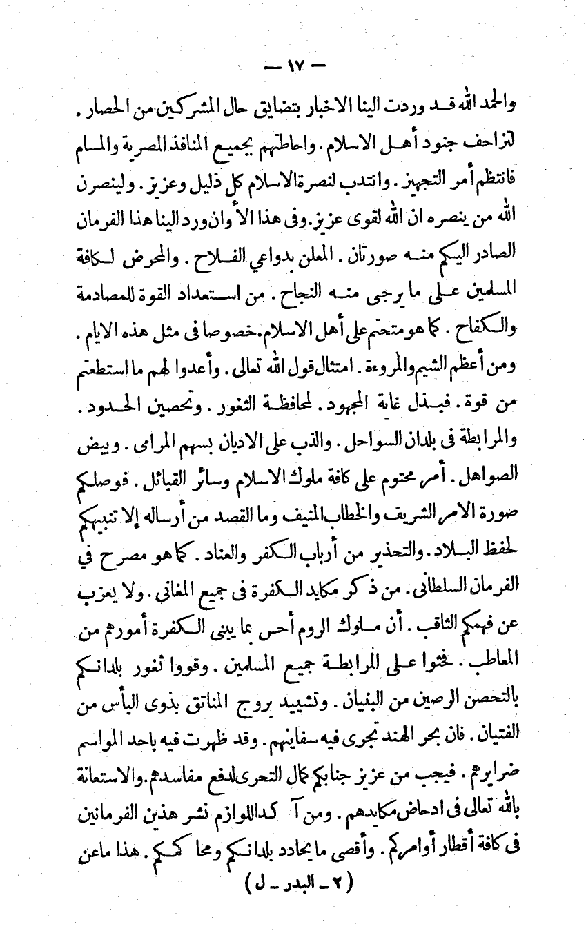 وَالْحَمْد الله قد وَردت إِلَيْنَا الْأَخْبَار بتضايق حَال الْمُشْركين من الْحصار لتزاحف جنود أهل الْإِسْلَام وإحاطتهم بِجَمِيعِ المنافذ المصرية والمسام فانتظم أَمر التَّجْهِيز وانتدب لنصرة الْإِسْلَام كل ذليل وعزيز ولينصرن الله من ينصره إن الله لقوي عَزِيز وفى هَذَا الأوان ورد الينا هَذَا الفرمان الصَّادِر إليكم مِنْهُ صُورَتَانِ الْمُعْلن بدواعي الْفَلاح والمحرض لكافة الْمُسلمين على مَا يُرْجَى مِنْهُ النجاح من استعداد الْقُوَّة للمصادمة والكفاح