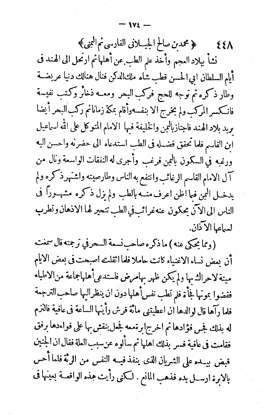 نَشأ بِبِلَاد الْعَجم وَأخذ علم الطِّبّ عَن أَهلهَا ثمَّ ارتحل إِلَى الْهِنْد فِي أَيَّام السُّلْطَان أبي الْحسن قطب شاه ملك الدكن فنال هُنَالك دنيا عريضة وطار ذكره ثمَّ توجه لِلْحَجِّ فَركب الْبَحْر وَمَعَهُ ذخائر وَكتب نفيسة فانكسر الْمركب وَلم يخرج إلا بِنَفسِهِ وَأقَام بِمَكَّة زَمَانا ثمَّ ركب الْبَحْر أَيْضا يُرِيد بِلَاد الْهِنْد فاجتاز بِالْيمن والخليفة فِيهَا الإِمَام المتَوَكل على الله إِسْمَاعِيل ابْن الْقَاسِم فَلَمَّا تحقق فَضله فِي الطِّبّ استدعاه إِلَى حَضرته وَأحسن إِلَيْهِ ورغبه فِي السّكُون بِالْيمن فَرغب وأجرى لَهُ النَّفَقَات الواسعة ونال من آل الإِمَام الْقَاسِم الرغائب وانتفع بِهِ النَّاس وطار صيته واشتهر ذكره وَلم يدْخل الْيمن فِيمَا أظن أعرف مِنْهُ بالطب وَلم يزل ذكره مَشْهُورا فِي النَّاس إِلَى الْآن يحكون عَنهُ غرائب فِي الطِّبّ تتحير لَهَا الأذهان وتطرب لسماعها الآذان