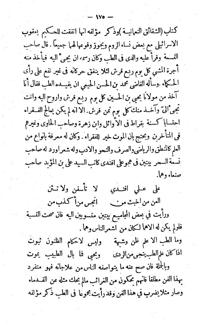 (وَمَا الطِّبّ إلا علم ظن وشبهة ... وَلَيْسَ لأحكام الظنون ثُبُوت)