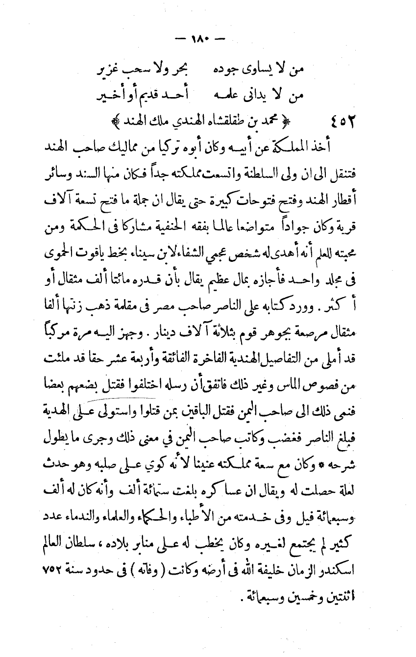 (من لَا يداني علمه ... أحد قديم اَوْ أخير) مُحَمَّد بن طقلقشاه الْهِنْدِيّ ملك الْهِنْد