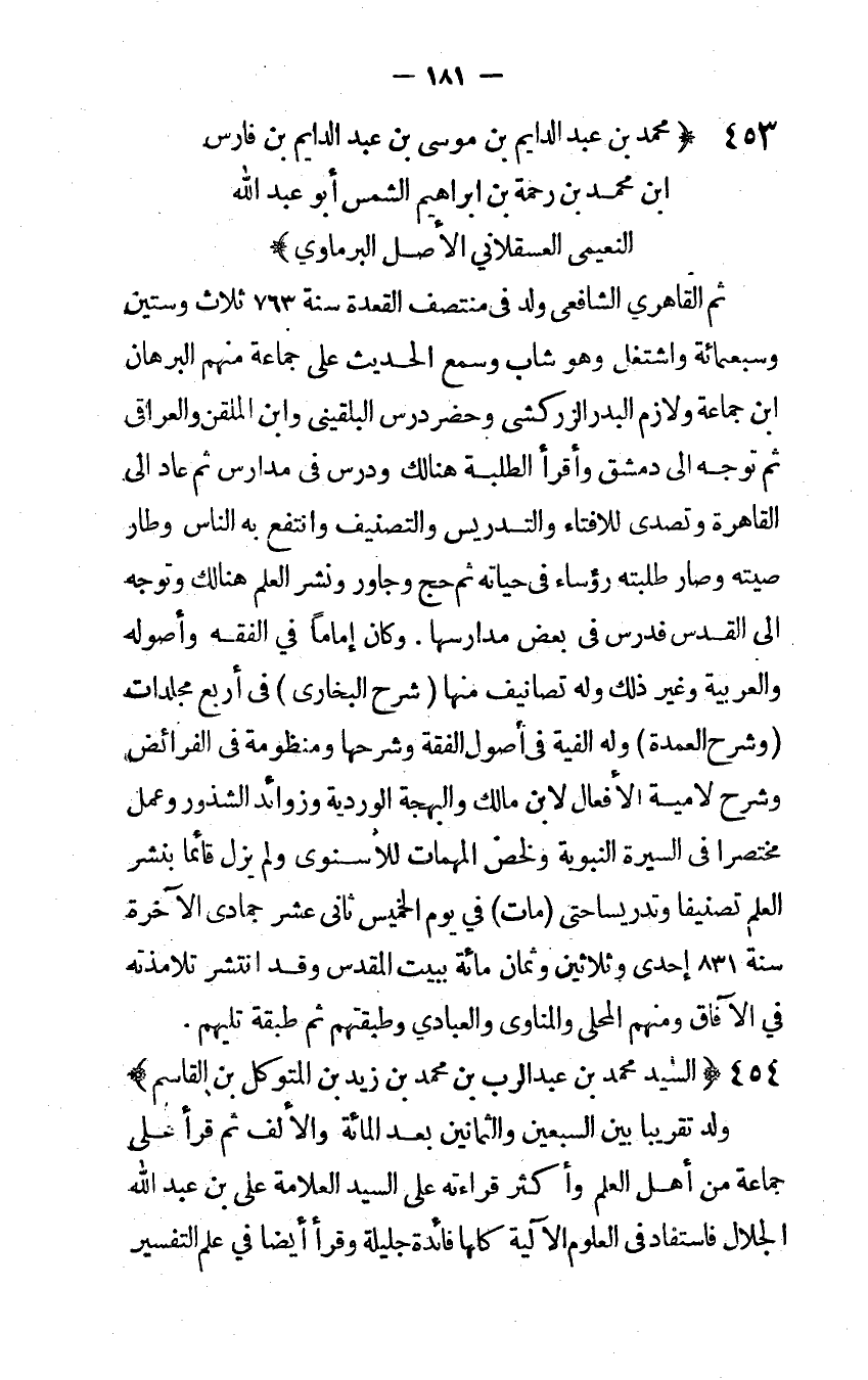 ثمَّ القاهري الشافعي ولد فِي منتصف الْقعدَة سنة 763 ثَلَاث وَسِتِّينَ وَسَبْعمائة واشتغل وَهُوَ شَاب وَسمع الحَدِيث على جمَاعَة مِنْهُم الْبُرْهَان ابْن جمَاعَة ولازم الْبَدْر الزركشي وَحضر درس البلقيني وَابْن الملقن والعراقي ثمَّ توجه إِلَى دمشق وأقرأ الطّلبَة هُنَالك ودرس فِي مدارس ثمَّ عَاد إِلَى الْقَاهِرَة وتصدى للإفتاء والتدريس والتصنيف وانتفع بِهِ النَّاس وطار صيته وَصَارَ طلبته رُؤَسَاء فِي حَيَاته ثمَّ حج وجاور وَنشر الْعلم هُنَالك وَتوجه إِلَى الْقُدس فدرس فِي بعض مدارسها