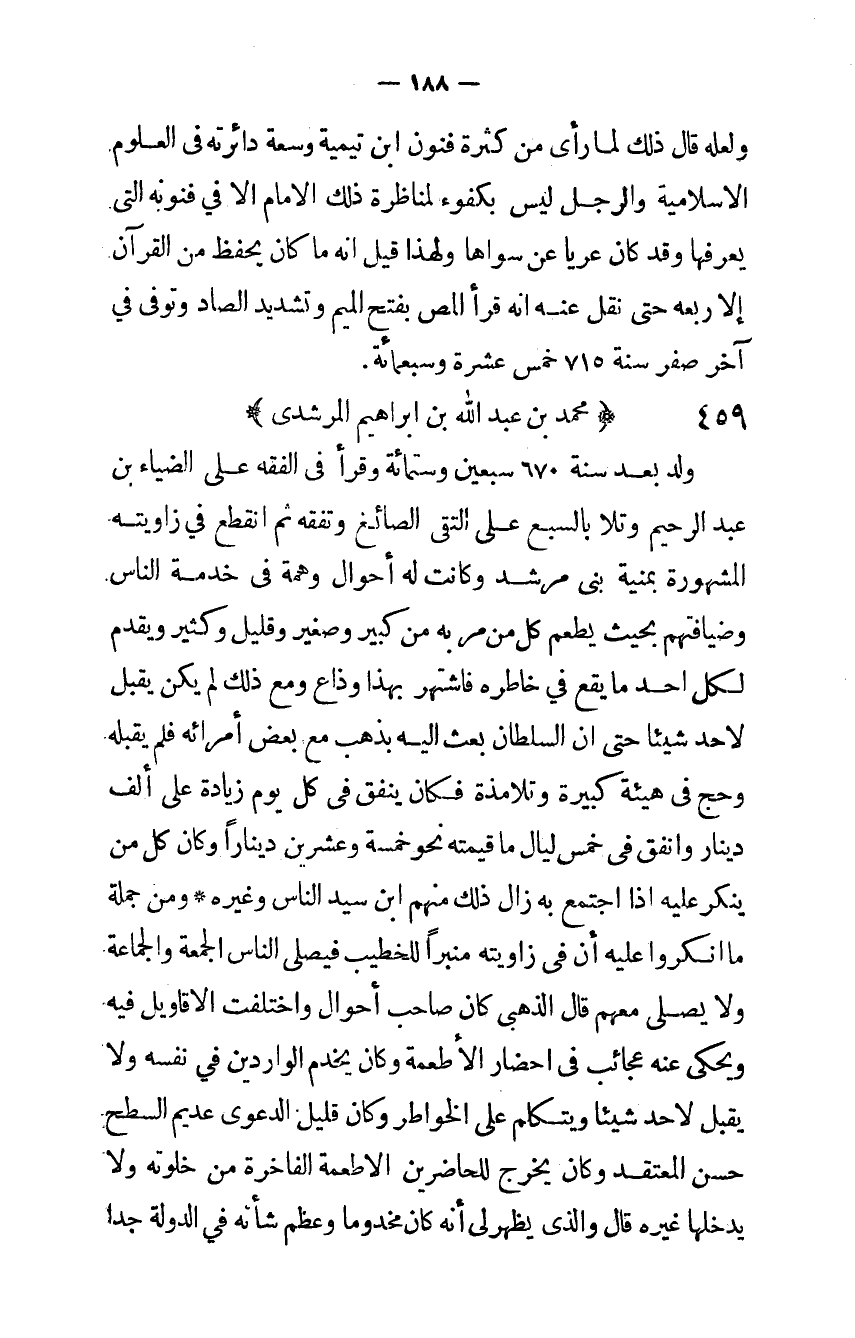 وَلَعَلَّه قَالَ ذَلِك لما رأى من كَثْرَة فنون ابْن تَيْمِية وسعة دائرته فِي الْعُلُوم الإسلامية وَالرجل لَيْسَ بكفوء لمناظرة ذَلِك الإِمَام إلا فِي فنونه الَّتِى يعرفهَا وَقد كَانَ عريا عَن سواهَا وَلِهَذَا قيل أنه مَا كَانَ يحفظ من الْقُرْآن إِلَّا ربعه حَتَّى نقل عَنهُ أنه قَرَأَ المص بِفَتْح الْمِيم وَتَشْديد الصَّاد وتوفى فِي آخر صفر سنة 715 خمس عشرَة وَسَبْعمائة