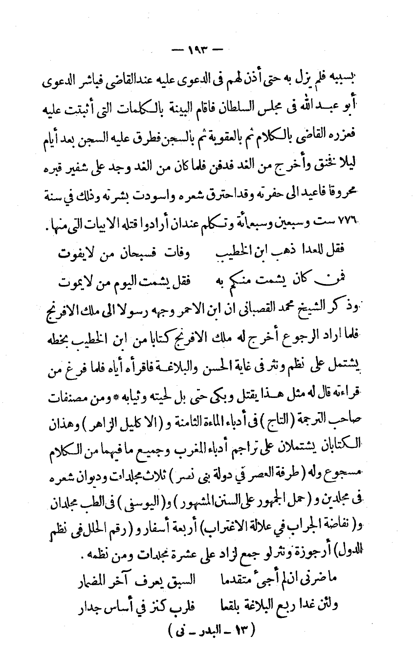 بِسَبَبِهِ فَلم يزل بِهِ حَتَّى أذن لَهُم فِي الدَّعْوَى عَلَيْهِ عِنْد القاضي فباشر الدَّعْوَى أَبُو عبد الله فِي مجْلِس السُّلْطَان فَأَقَامَ الْبَيِّنَة بالكلمات الَّتِى أَثْبَتَت عَلَيْهِ فعزره القاضي بالْكلَام ثمَّ بالعقوبة ثمَّ بالسجن فطرق عَلَيْهِ السجْن بعد أَيَّام لَيْلًا فخنق وَأخرج من الْغَد فَدفن فَلَمَّا كَانَ من الْغَد وجد على شَفير قَبره محروقا فأعيد إِلَى حفرته وَقد احْتَرَقَ شعره واسودت بَشرته وَذَلِكَ فِي سنة 776 سِتّ وَسبعين وَسَبْعمائة وَتكلم عِنْد أن أَرَادوا قَتله الأبيات الَّتِى مِنْهَا