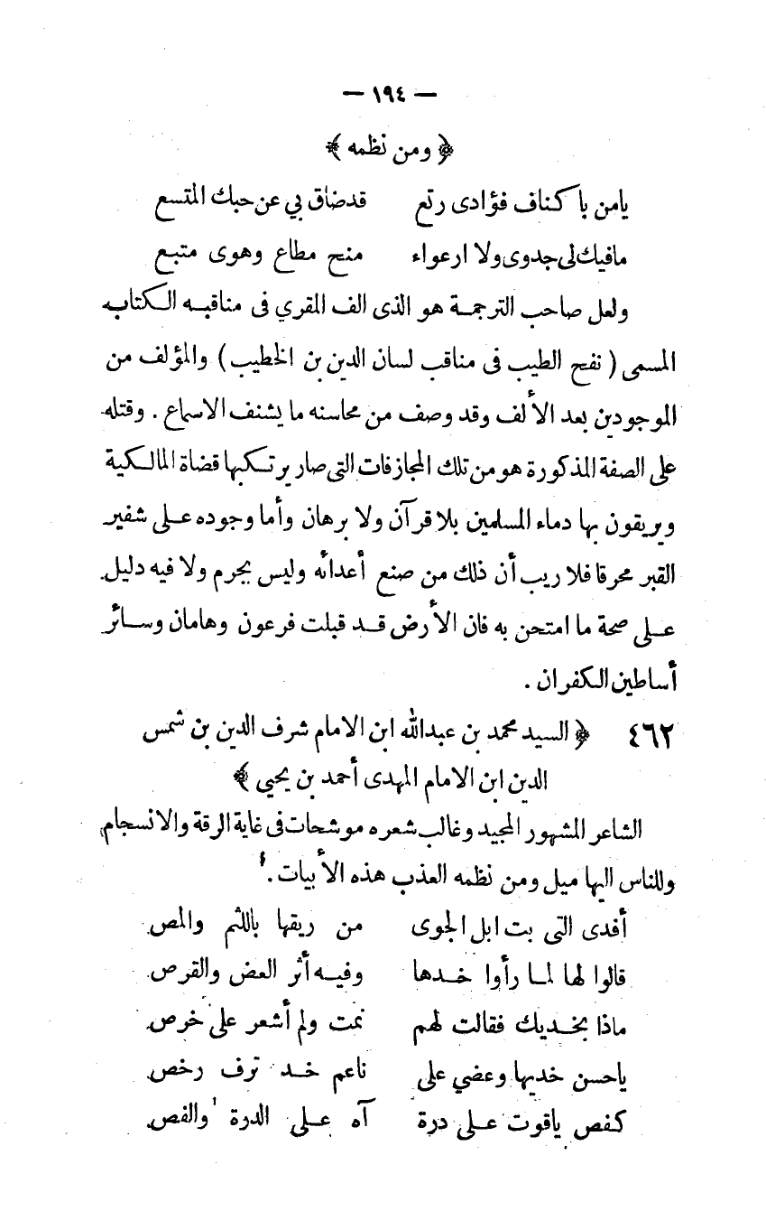 الشَّاعِر الْمَشْهُور الْمجِيد وغالب شعره موشحات فِي غَايَة الرقة والانسجام وَلِلنَّاسِ إِلَيْهَا ميل وَمن نظمه العذب هَذِه الأبيات