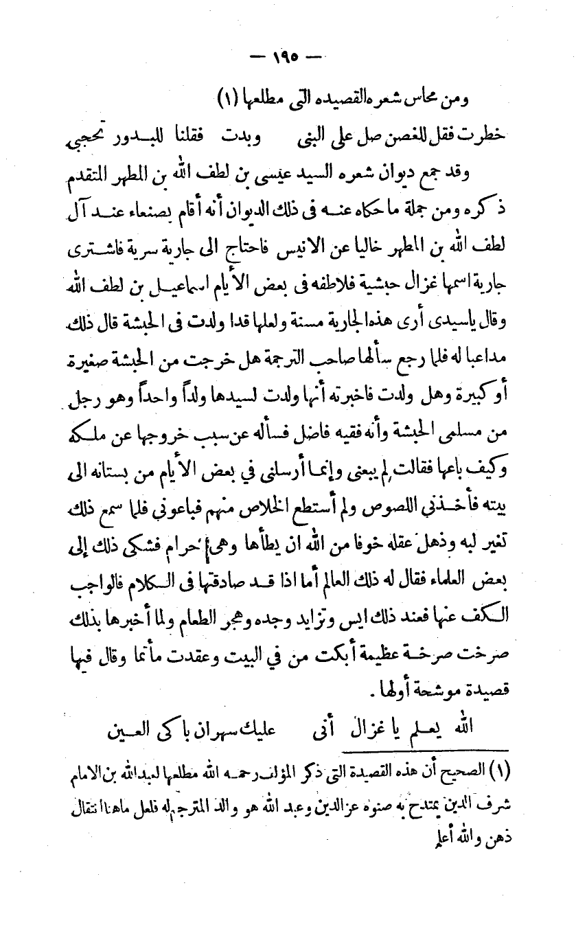 وَقد جمع ديوَان شعره السَّيِّد عِيسَى بن لطف الله بن المطهر الْمُتَقَدّم ذكره وَمن جملَة مَا حَكَاهُ عَنهُ فِي ذَلِك الدِّيوَان أَنه أَقَامَ بِصَنْعَاء عِنْد آل لطف الله بن المطهر خَالِيا عَن الأنيس فَاحْتَاجَ إِلَى جَارِيَة سَرِيَّة فَاشْترى جَارِيَة اسْمهَا غزال حبشية فلاطفه فِي بعض الْأَيَّام إِسْمَاعِيل بن لطف الله وَقَالَ يَا سيدي أرى هَذِه الْجَارِيَة مُسِنَّة ولعلها قد ولدت فِي الْحَبَشَة قَالَ ذَلِك مداعبا لَهُ فَلَمَّا رَجَعَ سَأَلَهَا صَاحب التَّرْجَمَة هَل خرجت من الْحَبَشَة صَغِيرَة أَو كَبِيرَة وَهل ولدت فَأَخْبَرته أَنَّهَا ولدت لسَيِّدهَا ولدا وَاحِدًا وَهُوَ رجل من مسلمى الْحَبَشَة وَأَنه فَقِيه فَاضل فَسَأَلَهُ عَن سَبَب خُرُوجهَا عَن ملكه وَكَيف بَاعهَا فَقَالَت لم يبعني وَإِنَّمَا أرسلني فِي بعض الْأَيَّام من بستانه إِلَى بَيته فأخذني اللُّصُوص وَلم أستطع الْخَلَاص مِنْهُم فباعوني فَلَمَّا سمع ذَلِك تغير لبه وَذهل عقله خوفا من الله أن يَطَأهَا وهي حرَام فَشكى ذَلِك إِلَى بعض الْعلمَاء فَقَالَ لَهُ ذَلِك الْعَالم أما إِذا قد صادقتها فِي الْكَلَام فَالْوَاجِب الْكَفّ عَنْهَا فَعِنْدَ ذَلِك آيس وتزايد وجده وهجر الطَّعَام وَلما أخْبرهَا بذلك صرخت صرخة عَظِيمَة أبكت من فِي الْبَيْت وعقدت مأتما وَقَالَ فِيهَا قصيدة موشحة أَولهَا