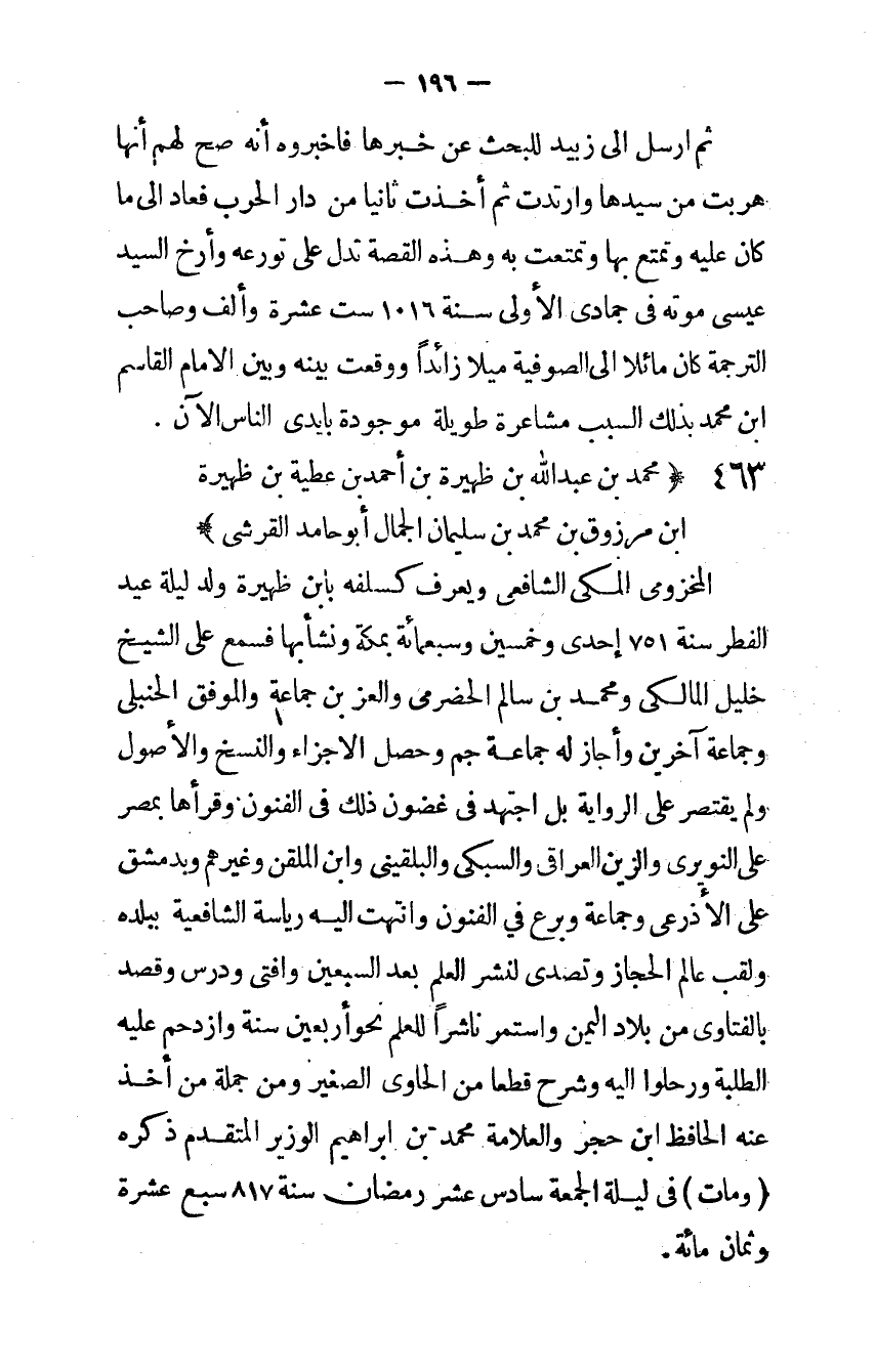 المخزومي المكي الشافعي وَيعرف كسلفه بِابْن ظهيرة ولد لَيْلَة عيد الْفطر سنة 751 إِحْدَى وَخمسين وَسَبْعمائة بِمَكَّة وَنَشَأ بهَا فَسمع على الشَّيْخ خَلِيل المالكي وَمُحَمّد بن سَالم الحضرمي والعز بن جمَاعَة والموفق الحنبلي وَجَمَاعَة آخَرين وَأَجَازَ لَهُ جمَاعَة جم وَحصل الْإِجْزَاء والنسخ وَالْأُصُول وَلم يقْتَصر على الرِّوَايَة بل اجْتهد فِي غُضُون ذَلِك فِي الْفُنُون وَقرأَهَا بِمصْر على النويري والزين العراقي والسبكي والبلقيني وَابْن الملقن وَغَيرهم وبدمشق على الأذرعي وَجَمَاعَة وبرع فِي الْفُنُون وانتهت إِلَيْهِ رياسة الشَّافِعِيَّة بِبَلَدِهِ ولقب عَالم الْحجاز وتصدى لنشر الْعلم بعد السّبْعين وَأفْتى ودرس وَقصد بالفتاوى من بِلَاد الْيمن وَاسْتمرّ ناشرا للْعلم نَحْو أَرْبَعِينَ سنة وازدحم عَلَيْهِ الطّلبَة ورحلوا إِلَيْهِ وَشرح قطعا من الحاوي الصَّغِير وَمن جملَة من أَخذ عَنهُ الْحَافِظ ابْن حجر والعلامة مُحَمَّد بن إِبْرَاهِيم الْوَزير الْمُتَقَدّم ذكره وَمَات فِي لليلة الْجُمُعَة سادس عشر رَمَضَان سنة 817 سبع عشرَة وثمان مائَة