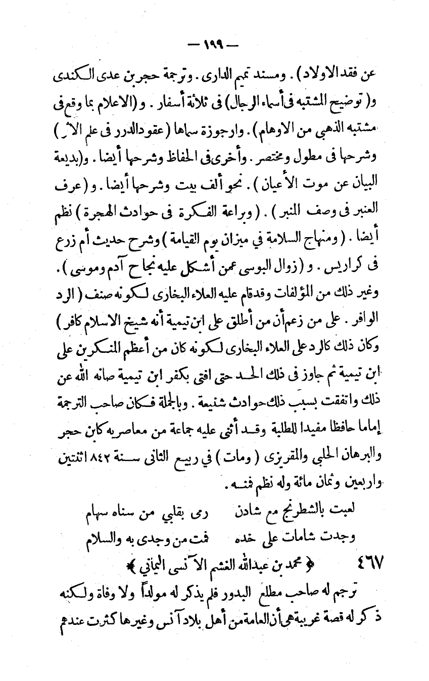 وَغير ذَلِك من المؤلفات وَقد قَامَ عَلَيْهِ الْعَلَاء البخاري لكَونه صنف الرَّد الوافر على من زعم أَن من أطلق على ابْن تَيْمِية أَنه شيخ الْإِسْلَام كَافِر وَكَانَ ذَلِك كالرد على الْعَلَاء البخاري لكَونه كَانَ من أعظم المنكرين على ابْن تَيْمِية ثمَّ جَاوز فِي ذَلِك الْحَد حَتَّى أفتى بِكفْر ابْن تَيْمِية صانه الله عَن ذَلِك واتفقت بِسَبَب ذَلِك حوادث شنيعة