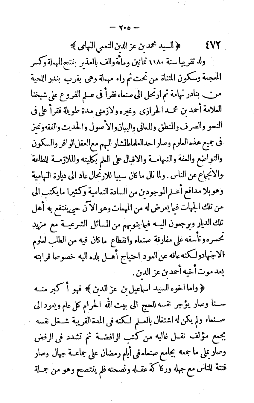 وَلما نَالَ مَا كَانَ سَببا للارتحال عَاد إِلَى دياره التهامية وَهُوَ بِلَا مدافع أعلم الْمَوْجُودين من السَّادة النعامية وَكَثِيرًا مَا يكْتب إِلَى من تِلْكَ الْجِهَات فِيمَا يعرض لَهُ من الْمُهِمَّات وَهُوَ الْآن حيى ينْتَفع بِهِ أهل تِلْكَ الديار ويرجعون إِلَيْهِ فِيمَا ينوبهم من الْمسَائِل الشَّرْعِيَّة مَعَ مزِيد تحسره وتأسفه على مُفَارقَة صنعاء وَانْقِطَاع مَا كَانَ فِيهِ من الطلب لعلوم الِاجْتِهَاد وَلكنه عاقه عَن الْعود احْتِيَاج أهل بَلَده إِلَيْهِ خُصُوصا قرَابَته بعد موت أَخِيه أَحْمد بن عز الدَّين