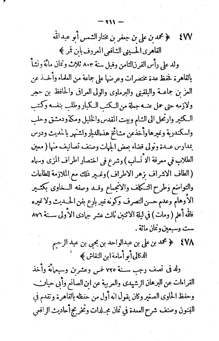 ولد على رَأس الْقرن الثَّامِن وَقيل سنة 803 ثَلَاث وثمان مائَة وَنَشَأ بِالْقَاهِرَةِ فحفظ عدَّة مختصرات وعرضها على جمَاعَة من الْعلمَاء وَأخذ عَن الْعِزّ بن جمَاعَة والبلقيني والبرماوي والولى العراقى والحافظ بن حجر ولازمه حَتَّى حمل عَنهُ جملَة من الْكتب الْكِبَار وَطلب بِنَفسِهِ وَكتب الْكثير وارتحل إِلَى الشَّام وَبَيت الْمُقَدّس والخليل وَمَكَّة ودمشق وحلب وإسكندرية وَغَيرهَا وَأخذ عَن مشائخ هَذِه الديار واشتهر بِالْحَدِيثِ ودرس بمدارس عدَّة وَتَوَلَّى قَضَاء بعض الْجِهَات وصنف تصانيف مِنْهَا معِين الطلاب فِي معرفَة الْأَنْسَاب وَشرع فِي اخْتِصَار أطراف المزي وَسَماهُ ألطاف الْأَشْرَاف بزهر الْأَطْرَاف وَغير ذَلِك مَعَ الْمُلَازمَة للطاعات والتواضع وَطرح التَّكَلُّف والانجماع وَقد وَصفه السخاوي بِكَثِير الأوهام وَعدم حسن التَّصَرُّف وَكَونه غير بارع بفن الحَدِيث وَلَا غَيره فَالله أعلم وَمَات فِي لَيْلَة الِاثْنَيْنِ ثَالِث عشر جُمَادَى الأولى سنة 876 سِتّ وَسبعين وثمان مائَة