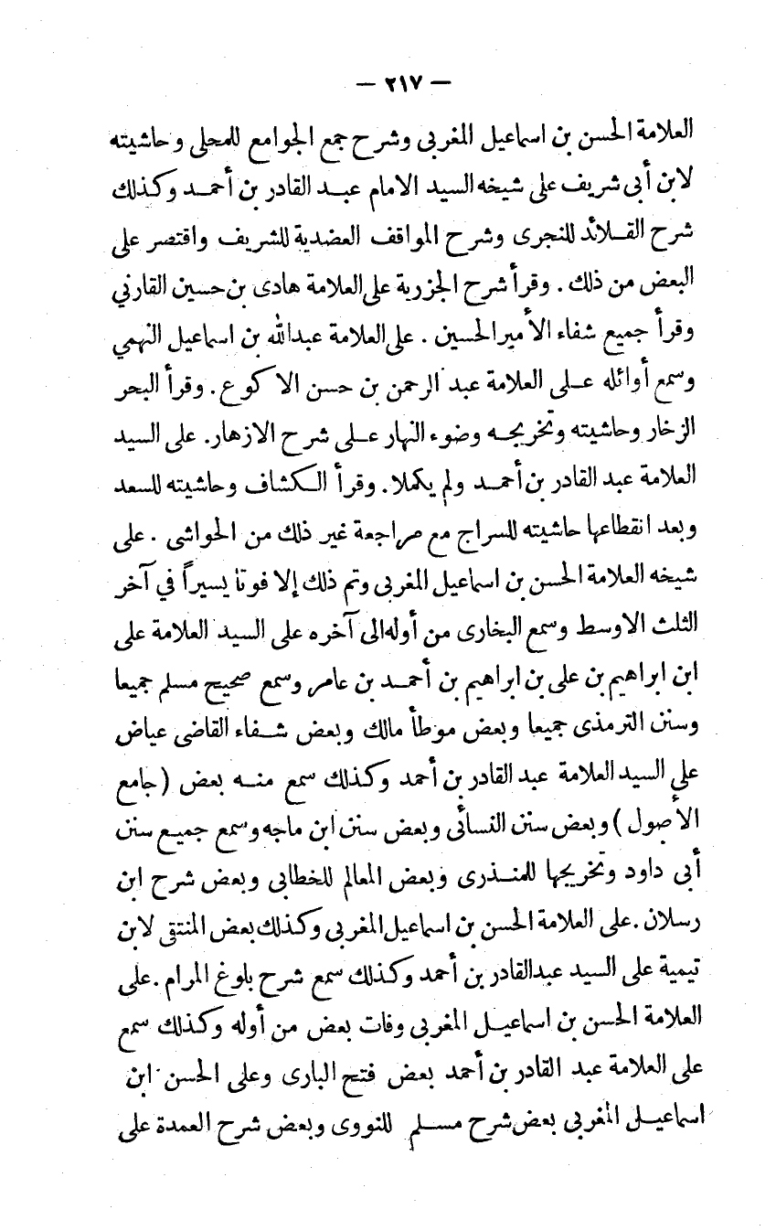 وَقَرَأَ الْكَشَّاف وحاشيته للسعد وَبعد انقطاعها حَاشِيَته للسراج مَعَ مُرَاجعَة غير ذَلِك من الحواشي على شَيْخه الْعَلامَة الْحسن بن إِسْمَاعِيل المغربي وَتمّ ذَلِك إِلَّا فوتا يَسِيرا فِي آخر الثُّلُث الْأَوْسَط وَسمع البخاري من أَوله إِلَى آخِره على السَّيِّد الْعَلامَة على ابْن إِبْرَاهِيم بن علي بن إِبْرَاهِيم بن أَحْمد بن عَامر وَسمع صَحِيح مُسلم جَمِيعًا وَسنَن الترمذي جَمِيعًا وَبَعض موطأ مَالك وَبَعض شِفَاء القاضي عِيَاض على السَّيِّد الْعَلامَة عبد الْقَادِر بن أَحْمد وَكَذَلِكَ سمع مِنْهُ بعض جَامع الْأُصُول وَبَعض سنَن النسائي وَبَعض سنَن ابْن مَاجَه وَسمع جَمِيع سنَن أَبى دَاوُد وتخريجها للمنذري وَبَعض المعالم للخطابي وَبَعض شرح ابْن رسْلَان على الْعَلامَة الْحسن بن إِسْمَاعِيل المغربي وَكَذَلِكَ بعض الْمُنْتَقى لِابْنِ تَيْمِية على السَّيِّد عبد الْقَادِر بن أَحْمد وَكَذَلِكَ سمع شرح بُلُوغ المرام على الْعَلامَة الْحسن بن إِسْمَاعِيل المغربي وَفَاتَ بعض من أَوله وَكَذَلِكَ سمع على الْعَلامَة عبد الْقَادِر بن أَحْمد بعض فتح البارى وعَلى الْحسن ابْن إِسْمَاعِيل المغربي بعض شرح مُسلم للنووي وَبَعض شرح الْعُمْدَة على