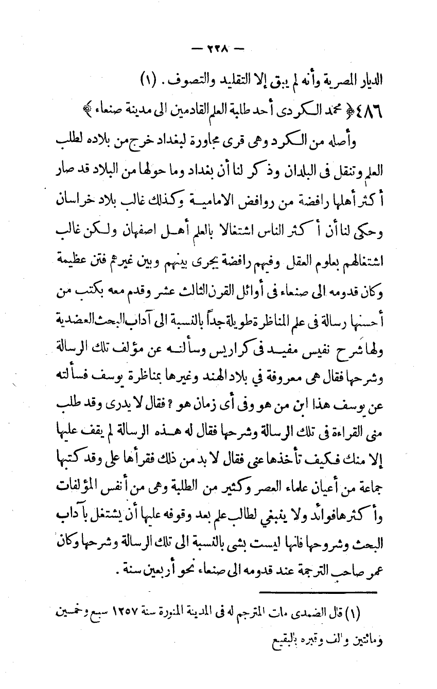 وَأَصله من الكرد وهي قرى مجاورة لبغداد خرج من بِلَاده لطلب الْعلم وتنقل فِي الْبلدَانِ وَذكر لنا أَن بَغْدَاد وَمَا حولهَا من الْبِلَاد قد صَار أَكثر أَهلهَا رافضة من روافض الإمامية وَكَذَلِكَ غَالب بِلَاد خُرَاسَان وَحكى لنا أَن أَكثر النَّاس اشتغالا بِالْعلمِ أهل أصفهان وَلَكِن غَالب اشتغالهم بعلوم الْعقل وَفِيهِمْ رافضة يجري بَينهم وَبَين غَيرهم فتن عَظِيمَة وَكَانَ قدومه إِلَى صنعاء فِي أَوَائِل الْقرن الثَّالِث عشر وَقدم مَعَه بكتب من أحْسنهَا رِسَالَة فِي علم المناظرة طَوِيلَة جدا بِالنِّسْبَةِ إِلَى آدَاب الْبَحْث العضدية وَلها شرح نَفِيس مُفِيد فِي كراريس وَسَأَلته عَن مؤلف تِلْكَ الرسَالَة وَشَرحهَا فَقَالَ هي مَعْرُوفَة فِي بِلَاد الْهِنْد وَغَيرهَا بمناظرة يُوسُف فَسَأَلته عَن يُوسُف هَذَا ابْن من هُوَ وَفِي أي زمَان هُوَ فَقَالَ لَا يدرى وَقد طلب مني الْقِرَاءَة فِي تِلْكَ الرسَالَة وَشَرحهَا فَقَالَ لَهُ هَذِه الرسَالَة لم يقف عَلَيْهَا إِلَّا مِنْك فَكيف تأخذها عَنى فَقَالَ لابد من ذَلِك فقرأها علي وَقد كتبهَا جمَاعَة من أَعْيَان عُلَمَاء الْعَصْر وَكثير من الطّلبَة وهي من أنفس المؤلفات وأكثرها فَوَائِد وَلَا يَنْبَغِي لطَالب علم بعد وُقُوفه عَلَيْهَا أَن يشْتَغل بآداب الْبَحْث وشروحها فَإِنَّهَا لَيست بشئ بِالنِّسْبَةِ إِلَى تِلْكَ الرسَالَة وَشَرحهَا وَكَانَ عمر صَاحب التَّرْجَمَة عِنْد قدومه إِلَى صنعاء نَحْو أَرْبَعِينَ سنة