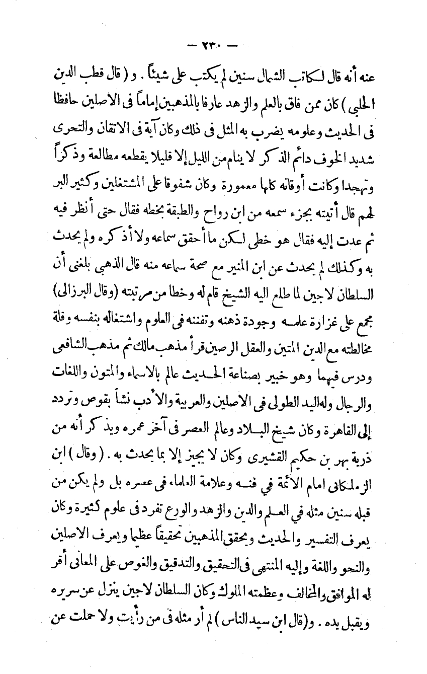 وَقَالَ قطب الدَّين الحلبي كَانَ مِمَّن فاق بِالْعلمِ والزهد عَارِفًا بالمذهبين إِمَامًا فِي الْأَصْلَيْنِ حَافِظًا فِي الحَدِيث وعلومه يضْرب بِهِ الْمثل فِي ذَلِك وَكَانَ آيَة فِي الإتقان والتحري شَدِيد الْخَوْف دَائِم الذكر لَا ينَام من اللَّيْل إِلَّا قَلِيلا يقطعهُ مطالعة وذكرا وتهجدا وَكَانَت أوقاته كلهَا معمورة وَكَانَ شفوقاً على المشتغلين وَكثير الْبر لَهُم قَالَ أَتَيْته بِجُزْء سَمعه من ابْن رواح والطبقة بِخَطِّهِ فَقَالَ حَتَّى أنظر فِيهِ ثمَّ عدت إِلَيْهِ فَقَالَ هُوَ خطي لَكِن مَا أحقق سَمَاعه وَلَا أذكرهُ وَلم يحدث بِهِ وَكَذَلِكَ لم يحدث عَن ابْن الْمُنِير مَعَ صِحَة سَمَاعه مِنْهُ قَالَ الذهبي بلغني أَن السُّلْطَان لاجين لما طلع إِلَيْهِ الشَّيْخ قَامَ لَهُ وخطا من مرتبته وَقَالَ البرزالى مجمع على غزارة علمه وجودة ذهنه وتفننه فِي الْعُلُوم واشتغاله بِنَفسِهِ وَقلة مخالطته مَعَ الدَّين المتين وَالْعقل الرصين قَرَأَ مَذْهَب مَالك ثمَّ مَذْهَب الشافعي ودرس فيهمَا وَهُوَ خَبِير بصناعة الحَدِيث عَالم بالأسماء والمتون واللغات وَالرِّجَال وَله الْيَد الطُّولى فِي الْأَصْلَيْنِ والعربية وَالْأَدب نَشأ بقوص وَتردد إِلَى الْقَاهِرَة وَكَانَ شيخ الْبِلَاد وعالم الْعَصْر فِي آخر عمره وَيذكر أَنه من ذُرِّيَّة بهر بن حَكِيم القشيري وَكَانَ لَا يُجِيز إِلَّا بِمَا يحدث بِهِ