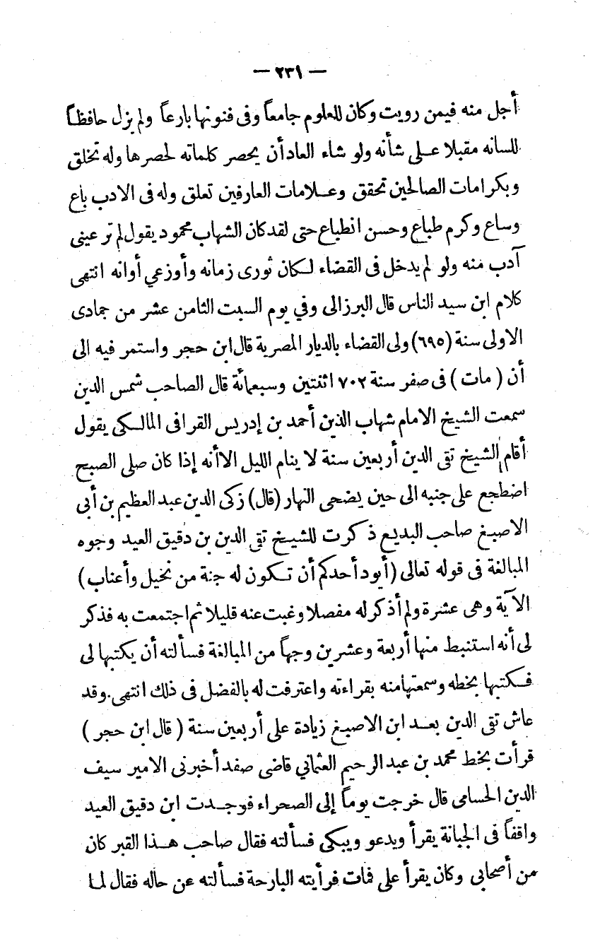 أجل مِنْهُ فِيمَن رويت وَكَانَ للعلوم جَامعا وَفِي فنونها بارعا وَلم يزل حَافِظًا لِلِسَانِهِ مُقبلا على شَأْنه وَلَو شَاءَ الْعَاد أَن يحصر كَلِمَاته لحصرها وَله تخلق وبكرامات الصَّالِحين تحقق وعلامات العارفين تعلق وَله فِي الْأَدَب بَاعَ وساع وكرم طباع وَحسن انطباع حَتَّى لقد كَانَ الشهَاب مَحْمُود يَقُول لم تَرَ عيني آدب مِنْهُ وَلَو لم يدْخل فِي الْقَضَاء لَكَانَ ثوري زَمَانه وأوزعي أَوَانه انْتهى كَلَام ابْن سيد النَّاس قَالَ البرزالى وَفِي يَوْم السبت الثَّامِن عشر من جُمَادَى الأولى سنة 695 ولي الْقَضَاء بالديار المصرية قَالَ ابْن حجر وَاسْتمرّ فِيهِ إِلَى أن مَاتَ فِي صفر سنة 702 اثْنَتَيْنِ وَسَبْعمائة قَالَ الصاحب شمس الدَّين سَمِعت الشَّيْخ الإِمَام شهَاب الدَّين أَحْمد بن إِدْرِيس القرافي المالكي يَقُول أَقَامَ الشَّيْخ تقي الدَّين أَرْبَعِينَ سنة لَا ينَام اللَّيْل إلا أَنه إِذا كَانَ صلى الصُّبْح اضْطجع على جنبه إِلَى حِين يضحى النَّهَار قَالَ زكي الدَّين عبد الْعَظِيم بن أَبى الْأَصْبَغ صَاحب البديع ذكرت للشَّيْخ تقي الدَّين بن دَقِيق الْعِيد وُجُوه الْمُبَالغَة فِي قَوْله تَعَالَى {أيود أحدكُم أَن تكون لَهُ جنَّة من نخيل وأعناب} الْآيَة وهي عشرَة وَلم أذكر لَهُ مفصلا وغبت عَنهُ قَلِيلا ثمَّ اجْتمعت بِهِ فَذكر لي أَنه استنبط مِنْهَا أَرْبَعَة وَعشْرين وَجها من الْمُبَالغَة فَسَأَلته أَن يَكْتُبهَا لي فكتبها بِخَطِّهِ وَسمعتهَا مِنْهُ بقرَاءَته وَاعْتَرَفت لَهُ بِالْفَضْلِ فِي ذَلِك انْتهى