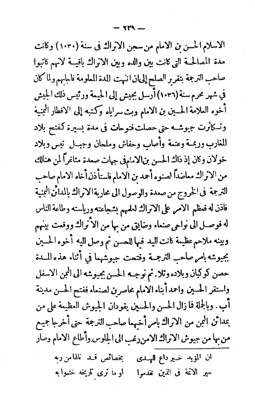 وَبِالْجُمْلَةِ فَمَا زَالَ الْحسن وَالْحُسَيْن يقودان الجيوش الْعَظِيمَة على من بمدائن الْيمن من الأتراك بِأَمْر أخيهما صَاحب التَّرْجَمَة حَتَّى أخرجَا جَمِيع من بهَا من جيوش الأتراك إلا من رغب إِلَى الْجُلُوس وأطاع الإِمَام وَصَارَ