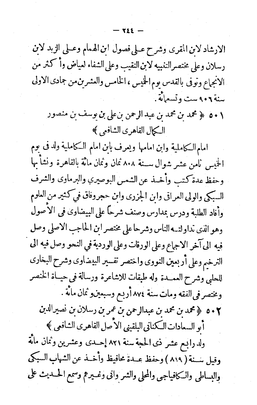 إمام الكاملية وَابْن إمامها وَيعرف بِابْن إمام الكاملية ولد فِي يَوْم الْخَمِيس ثامن عشر شَوَّال سنة 808 ثَمَان وثمان مائَة بِالْقَاهِرَةِ وَنَشَأ بهَا وَحفظ عدَّة كتب وَأخذ عَن الشَّمْس البوصيري والبرماوي والشرف السبكي والولي العراقي وَابْن الجزري وَابْن حجر وفَاق فِي كثير من الْعُلُوم وَأفَاد الطّلبَة ودرس بمدارس وصنف شرحا على البيضاوي فِي الْأُصُول وَهُوَ الذي تداولته النَّاس وشرحا على مُخْتَصر ابْن الْحَاجِب الأصلي وصل فِيهِ إِلَى آخر الْإِجْمَاع وعَلى الورقات وعَلى الوردية فِي النَّحْو وصل فِيهِ إِلَى التَّرْخِيم وعَلى أَرْبَعِينَ النووي وَاخْتصرَ تَفْسِير البيضاوي وَشرح البخاري للحلبي وَشرح الْعُمْدَة وَله طَبَقَات للأشاعرة ورسالة فِي حَيَاة الْخِنْصر ومختصر فِي الْفِقْه وَمَات سنة 874 أَربع وَسبعين وثمان مائَة