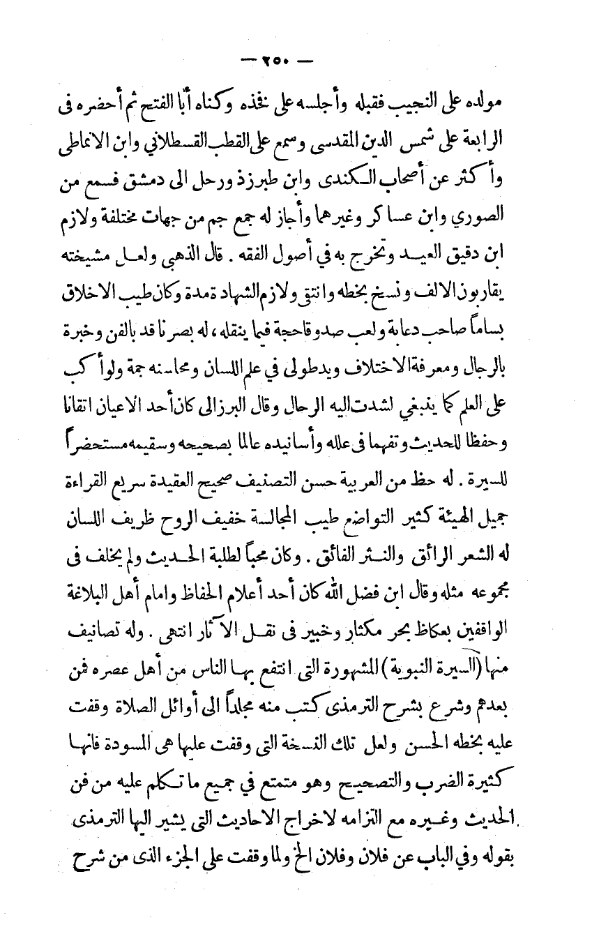 وَله تصانيف مِنْهَا السِّيرَة النَّبَوِيَّة الْمَشْهُورَة الَّتِى انْتفع بهَا النَّاس من أهل عصره فَمن بعدهمْ وَشرع بشرح الترمذي كتب مِنْهُ مجلدا إِلَى أَوَائِل الصَّلَاة وقفت عَلَيْهِ بِخَطِّهِ الْحسن وَلَعَلَّ تِلْكَ النُّسْخَة الَّتِى وقفت عَلَيْهَا هى المسودة فَإِنَّهَا كَثِيرَة الضَّرْب والتصحيح وَهُوَ متمتع فِي جَمِيع مَا تكلم عَلَيْهِ من فن الحَدِيث وَغَيره مَعَ الْتِزَامه لإِخْرَاج الْأَحَادِيث الَّتِى يُشِير إِلَيْهَا الترمذي بقوله وَفِي الْبَاب عَن فلَان وَفُلَان الخ وَلما وقفت على الْجُزْء الذي من شرح