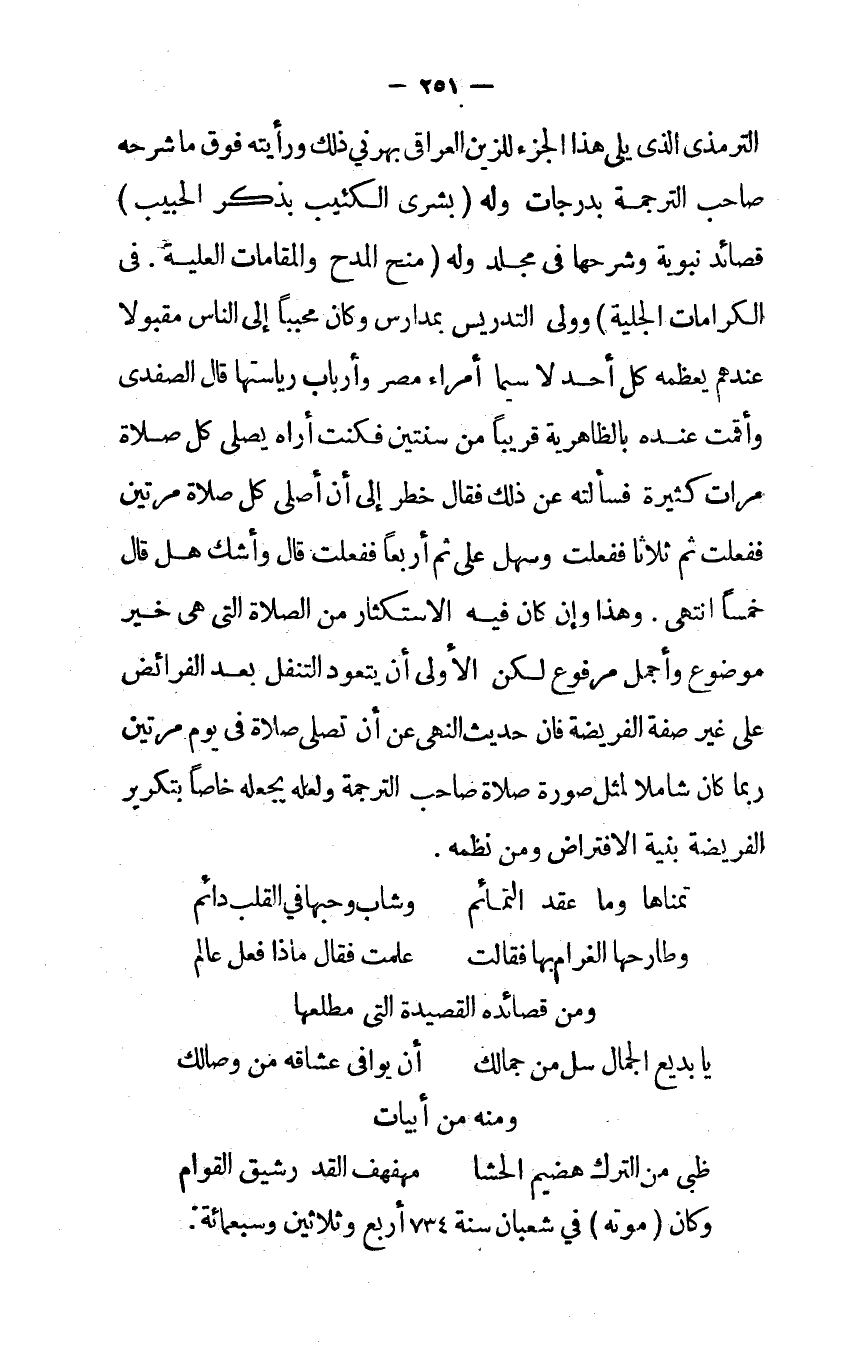 الترمذي الذي يلي هَذَا الْجُزْء للزين العراقي بهرني ذَلِك ورأيته فَوق مَا شَرحه صَاحب التَّرْجَمَة بدرجات وَله بشرى الكئيب بِذكر الحبيب قصائد نبوية وَشَرحهَا فِي مُجَلد وَله منح الْمَدْح والمقامات الْعلية فِي الكرامات الجلية وَولى التدريس بمدارس وَكَانَ محببا إِلَى النَّاس مَقْبُولًا عِنْدهم يعظمه كل أحد لاسيما أُمَرَاء مصر وأرباب رياستها قَالَ الصفدي وأقمت عِنْده بالظاهرية قَرِيبا من سنتَيْن فَكنت أرَاهُ يصلي كل صَلَاة مَرَّات كَثِيرَة فَسَأَلته عَن ذَلِك فَقَالَ خطر إِلَى أَن أصلي كل صَلَاة مرَّتَيْنِ فَفعلت ثمَّ ثَلَاثًا فَفعلت وَسَهل علي ثمَّ أَرْبعا فَفعلت قَالَ واشك هَل قَالَ خمْسا انْتهى