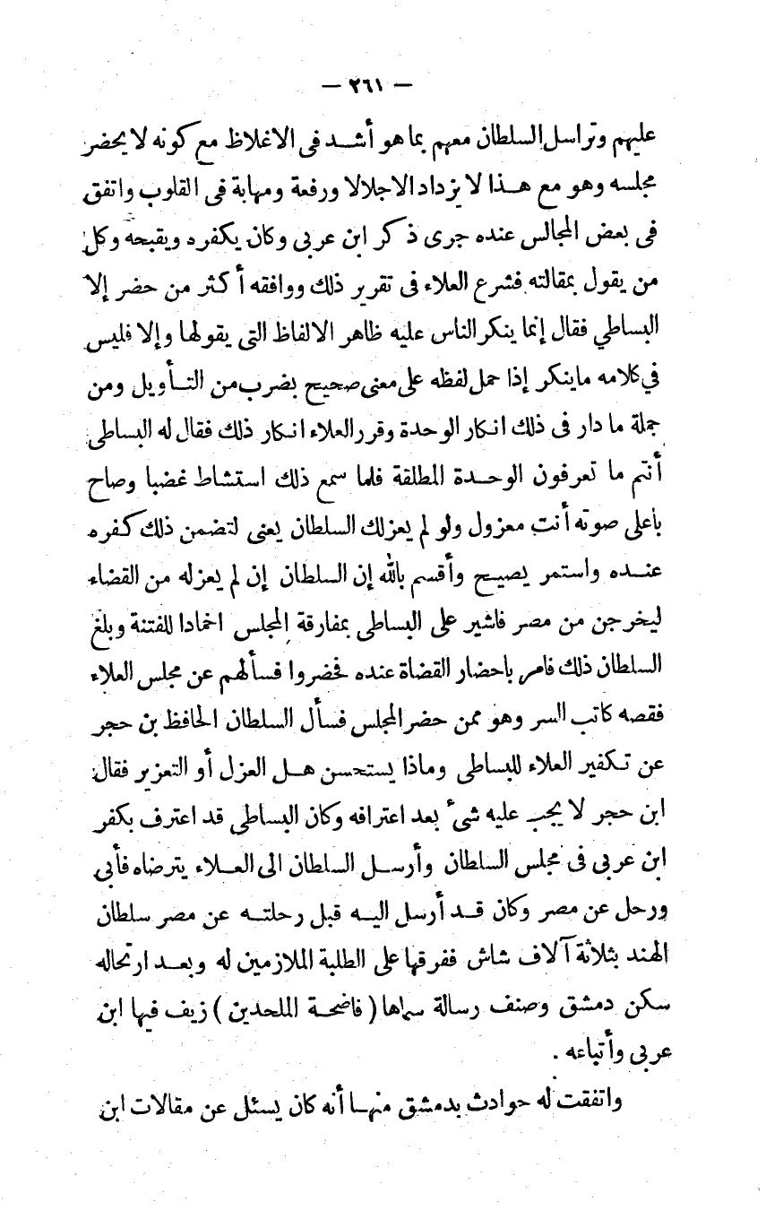 عَلَيْهِم وتراسل السُّلْطَان مَعَهم بِمَا هُوَ أَشد فِي الإغلاظ مَعَ كَونه لَا يحضر مَجْلِسه وَهُوَ مَعَ هَذَا لَا يزْدَاد إلا جلالا ورفعة ومهابة فِي الْقُلُوب وَاتفقَ فِي بعض الْمجَالِس عِنْده جرى ذكر ابْن عربي وَكَانَ يكفره ويقبحه وكل من يَقُول بمقالته فشرع الْعَلَاء فِي تَقْرِير ذَلِك وَوَافَقَهُ أَكثر من حضر إِلَّا الْبِسَاطِيّ فَقَالَ إِنَّمَا يُنكر النَّاس عَلَيْهِ ظَاهر الْأَلْفَاظ الَّتِى يَقُولهَا وَإِلَّا فَلَيْسَ فِي كَلَامه مَا يُنكر إِذا حمل لَفظه على معنى صَحِيح بِضَرْب من التَّأْوِيل وَمن جملَة مَا دَار فِي ذَلِك إنكار الْوحدَة وَقرر الْعَلَاء إنكار ذَلِك فَقَالَ لَهُ البساطي أَنْتُم مَا تعرفُون الْوحدَة الْمُطلقَة فَلَمَّا سمع ذَلِك استشاط غَضبا وَصَاح بِأَعْلَى صَوته أَنْت مَعْزُول وَلَو لم يعزلك السُّلْطَان يعْنى لتضمن ذَلِك كفره عِنْده وَاسْتمرّ يَصِيح وَأقسم بِاللَّه إِن السُّلْطَان إِن لم يعزله من الْقَضَاء ليخرجن من مصر فأشير على البساطي بمفارقة الْمجْلس إخمادا للفتنة وَبلغ السُّلْطَان ذَلِك فَأمر بإحضار الْقُضَاة عِنْده فَحَضَرُوا فَسَأَلَهُمْ عَن مجْلِس الْعَلَاء فقصه كَاتب السِّرّ وَهُوَ مِمَّن حضر الْمجْلس فَسَأَلَ السُّلْطَان الْحَافِظ بن حجر عَن تَكْفِير الْعَلَاء للبساطي وماذا يستحسن هَل الْعَزْل أَو التَّعْزِير فَقَالَ ابْن حجر لَا يجب عَلَيْهِ شئ بعد اعترافه وَكَانَ البساطي قد اعْترف بِكفْر ابْن عربي فِي مجْلِس السُّلْطَان وَأرْسل السُّلْطَان إلى الْعَلَاء يترضاه فَأبى ورحل عَن مصر وَكَانَ قد أرسل إِلَيْهِ قبل رحلته عَن مصر سُلْطَان الْهِنْد بِثَلَاثَة آلَاف شاش ففرقها على الطّلبَة الملازمين لَهُ وَبعد ارتحاله سكن دمشق وصنف رِسَالَة سَمَّاهَا فاضحة الْمُلْحِدِينَ زيف فِيهَا ابْن عربي وَأَتْبَاعه
