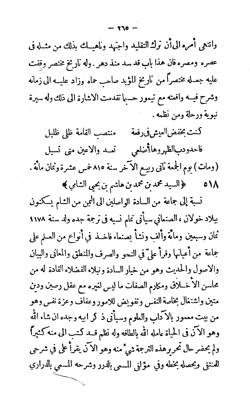 نِسْبَة إِلَى جمَاعَة من السَّادة الواصلين إِلَى الْيمن من الشَّام يسكنون بِبِلَاد خولان الصَّنْعَانِيّ سَيَأْتِي تَمام نسبه فِي تَرْجَمَة جده ولد سنة 1178 ثَمَان وَسبعين وَمِائَة وَألف وَنَشَأ بِصَنْعَاء فَأخذ فِي أَنْوَاع من الْعلم على جمَاعَة من أعيانها وَقَرَأَ علي فِي النَّحْو وَالصرْف والمنطق والمعاني وَالْبَيَان وَالْأُصُول والْحَدِيث وَهُوَ من خِيَار السَّادة ونبلاء الْفُضَلَاء القادة لَهُ من محَاسِن الْأَخْلَاق وَمَكَارِم الصِّفَات ماليس لغيره مَعَ عقل رصين وَدين متين واشتغال بِخَاصَّة النَّفس وتفويض للأمور وعفاف وَعزة نفس وَهُوَ من بَيت معمور بالآدب والعلوم وَسَيَأْتِي ذكر أبيه وجده إن شَاءَ الله وَهُوَ الْآن فِي الْحَيَاة عَامله الله بألطافه وَله نظم قد كتب إلي مِنْهُ كثيرا وَلم يحضر حَال تَحْرِير هَذِه التَّرْجَمَة شَيْء مِنْهُ وَهُوَ الْآن يقْرَأ علي فِي شرحي للمنتقى ويحصله بِخَطِّهِ وَفِي مؤلفي الْمُسَمّى بالدرر وَشَرحه المسمى بالدراري
