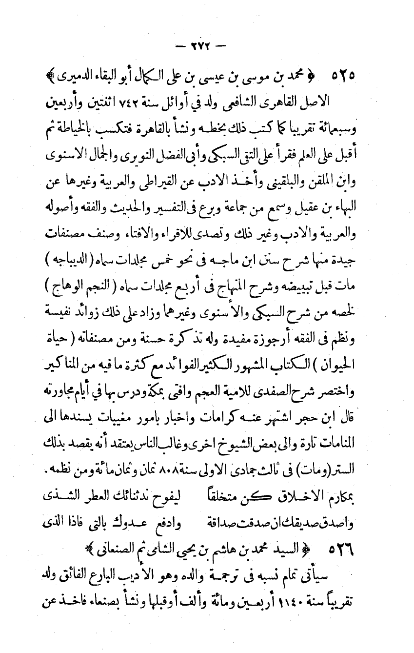 الأَصْل القاهري الشافعي ولد فِي أَوَائِل سنة 742 اثْنَتَيْنِ وَأَرْبَعين وَسَبْعمائة تَقْرِيبًا كَمَا كتب ذَلِك بِخَطِّهِ وَنَشَأ بِالْقَاهِرَةِ فتكسب بالخياطة ثمَّ أقبل على الْعلم فَقَرَأَ على التقي السبكي وأبي الْفضل النويري وَالْجمال الأسنوى وَابْن الملقن والبلقينى وَأخذ الْأَدَب عَن القيراطي والعربية وَغَيرهَا عَن الْبَهَاء بن عقيل وَسمع من جمَاعَة وبرع فِي التَّفْسِير والْحَدِيث وَالْفِقْه وأصوله والعربية وَالْأَدب وَغير ذَلِك وتصدى للإقراء والإفتاء وصنف مصنفات جَيِّدَة مِنْهَا شرح سنَن ابْن مَاجَه فِي نَحْو خمس مجلدات سَمَّاهُ الديباجة مَاتَ قبل تبييضه وَشرح الْمِنْهَاج فِي أَربع مجلدات سَمَّاهُ النَّجْم الْوَهَّاج لخصه من شرح السبكي والأسنوي وَغَيرهمَا وَزَاد على ذَلِك زَوَائِد نفيسة ونظم فِي الْفِقْه أرجوزة مفيدة وَله تذكرة حَسَنَة وَمن مصنفاته حَيَاة الْحَيَوَان الْكتاب الْمَشْهُور الْكثير الْفَوَائِد مَعَ كَثْرَة مافيه من الْمَنَاكِير وَاخْتصرَ شرح الصفدي للأمية الْعَجم وَأفْتى بِمَكَّة ودرس بهَا فِي أَيَّام مجاورته قَالَ ابْن حجر اشْتهر عَنهُ كرامات وأخبار بِأُمُور مغيبات يسندها إِلَى المنامات تَارَة وَإِلَى بعض الشُّيُوخ أخرى وغالب النَّاس يعْتَقد أَنه يقْصد بذلك السّتْر وَمَات فِي ثَالِث جُمَادَى الأولى سنة 808 ثَمَان وثمان مائَة وَمن نظمه