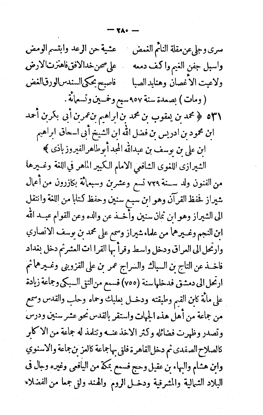 الشيرازى اللغوي الشافعي الإِمَام الْكَبِير الماهر فِي اللُّغَة وَغَيرهَا من الْفُنُون ولد سنة 729 تسع وَعشْرين وَسَبْعمائة بكازرون من أَعمال شيراز فحفظ الْقُرْآن وَهُوَ ابْن سبع سِنِين وَحفظ كتابا من اللُّغَة وانتقل إِلَى الشيراز وَهُوَ ابْن ثَمَان سِنِين وَأخذ عَن وَالِده وَعَن القوام عبد الله ابْن النَّجْم وَغَيرهمَا من عُلَمَاء شيراز وَسمع على مُحَمَّد بن يُوسُف الْأنْصَارِيّ وارتحل إِلَى الْعرَاق وَدخل وَاسِط وَقَرَأَ بهَا القراآت الْعشْر ثمَّ دخل بَغْدَاد فَأخذ عَن التَّاج بن السباك والسراج عمر بن علي القزويني وَغَيرهمَا ثمَّ ارتحل إِلَى دمشق فَدَخلَهَا سنة 755 فَسمع من التقي السبكي وَجَمَاعَة زِيَادَة على مائَة كَابْن الْقيم وطبقته وَدخل بعلبك وحماه وحلب والقدس وَسمع من جمَاعَة من أهل هَذِه الْجِهَات وَاسْتقر بالقدس نَحْو عشر سِنِين ودرس وتصدر وَظَهَرت فضائله وَكثر الْأَخْذ عَنهُ وتتلمذ لَهُ جمَاعَة من الأكابر كالصلاح الصفدي ثمَّ دخل الْقَاهِرَة فلقي بهَا جمَاعَة كالعز بن جمَاعَة والأسنوي وَابْن هِشَام والبهاء بن عقيل وَحج فَسمع بِمَكَّة من اليافعي وَغَيره وجال فِي الْبِلَاد الشمالية والمشرقية وَدخل الروم والهند ولقي جمعا من الْفُضَلَاء