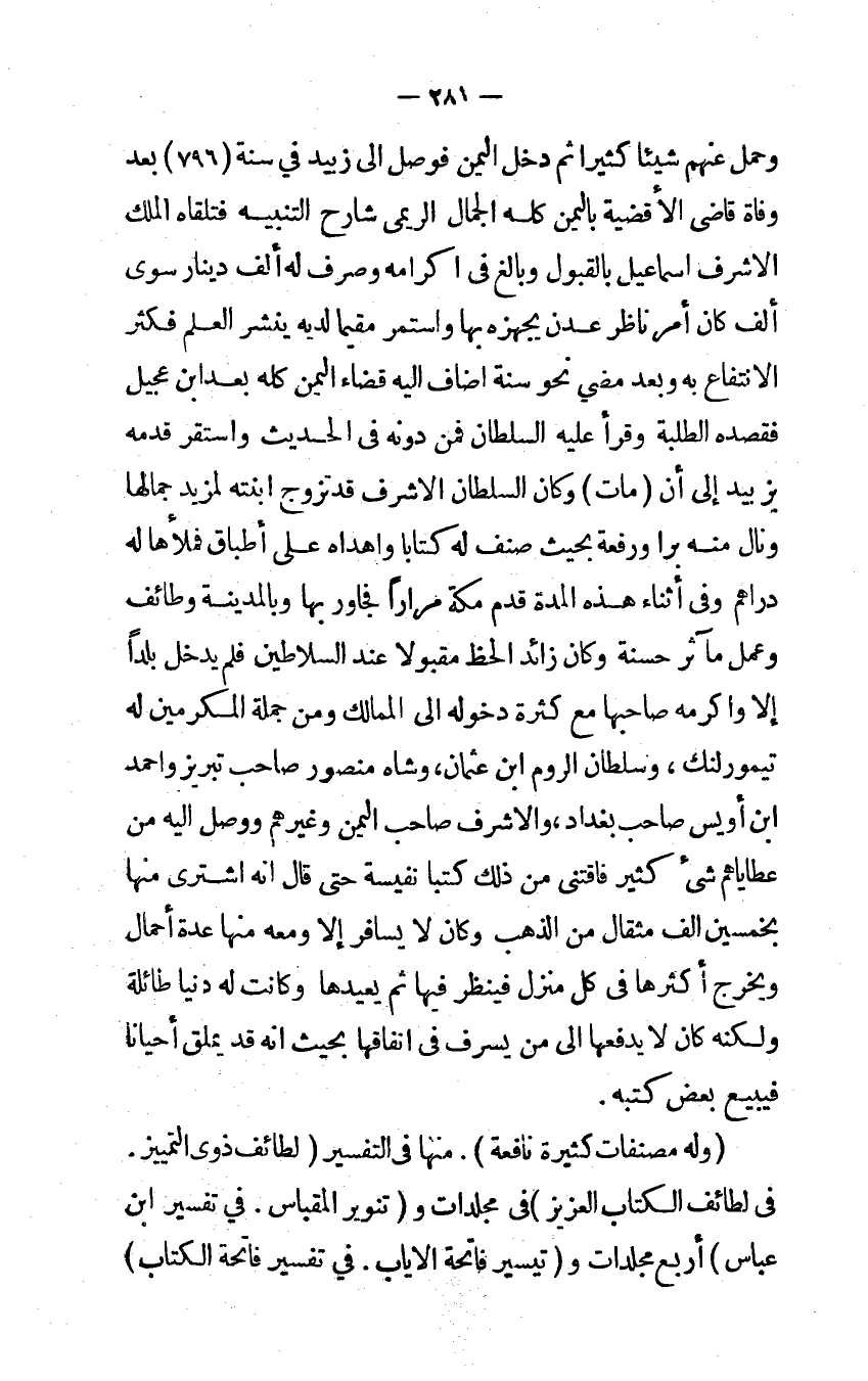 وَحمل عَنْهُم شَيْئا كثيرا ثمَّ دخل الْيمن فوصل إِلَى زبيد فِي سنة 796 بعد وَفَاة قاضي الْأَقْضِيَة بِالْيمن كُله الْجمال الريمي شَارِح التَّنْبِيه فَتَلقاهُ الْملك الْأَشْرَف إِسْمَاعِيل بِالْقبُولِ وَبَالغ فِي إكرامه وَصرف لَهُ ألف دِينَار سوى ألف كَانَ أَمر نَاظر عدن يجهزه بهَا وَاسْتمرّ مُقيما لَدَيْهِ ينشر الْعلم فَكثر الِانْتِفَاع بِهِ وَبعد مضي نَحْو سنة أضاف إِلَيْهِ قَضَاء الْيمن كُله بعد ابْن عجيل فقصده الطّلبَة وَقَرَأَ عَلَيْهِ السُّلْطَان فَمن دونه فِي الحَدِيث وَاسْتقر قدمه بزبيد إِلَى أَن مَاتَ وَكَانَ السُّلْطَان الْأَشْرَف قد تزوج ابْنَته لمزيد جمَالهَا ونال مِنْهُ برا ورفعة بِحَيْثُ صنف لَهُ كتابا وأهداه على أطباق فملأها لَهُ دَرَاهِم وَفِي أثْنَاء هَذِه الْمدَّة قدم مَكَّة مرَارًا فجاور بهَا وبالمدينة وطائف وَعمل مآثر حَسَنَة وَكَانَ زَائِد الْحَظ مَقْبُولًا عِنْد السلاطين فَلم يدْخل بَلَدا إِلَّا وأكرمه صَاحبهَا مَعَ كَثْرَة دُخُوله إِلَى الممالك وَمن جملَة الْمُكرمين لَهُ تيمورلنك وسلطان الروم ابْن عُثْمَان وشاه مَنْصُور صَاحب تبريز وَأحمد ابْن أويس صَاحب بَغْدَاد والأشرف صَاحب الْيمن وَغَيرهم وَوصل إِلَيْهِ من عطاياهم شَيْء كثير فاقتنى من ذَلِك كتبا نفيسة حَتَّى قَالَ إنه اشْترى مِنْهَا بِخَمْسِينَ ألف مِثْقَال من الذَّهَب وَكَانَ لَا يُسَافر إِلَّا وَمَعَهُ مِنْهَا عدَّة أحمال وَيخرج أَكْثَرهَا فِي كل منزل فَينْظر فِيهَا ثمَّ يُعِيدهَا وَكَانَت لَهُ دنيا طائلة وَلكنه كَانَ لَا يَدْفَعهَا إِلَى من يسرف فِي إنفاقها بِحَيْثُ أنه قد يملق أَحْيَانًا فيبيع بعض كتبه