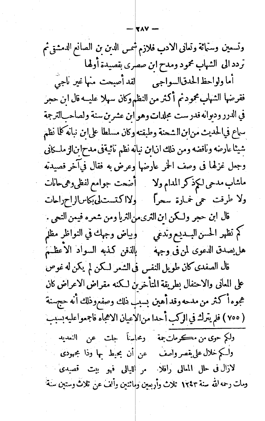 وَتِسْعين وسِتمِائَة وتعانى الْأَدَب فلازم شمس الدَّين بن الصَّانِع الدمشقي ثمَّ تردد إِلَى الشهَاب مَحْمُود ومدح ابْن صصري بقصيدة أَولهَا