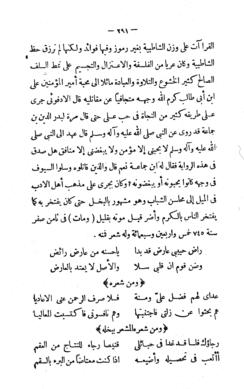 القراآت على وزن الشاطبية بِغَيْر رموز وفيهَا فَوَائِد وَلكنهَا لم ترزق حَظّ الشاطبية وَكَانَ عريا من الفلسفة والاعتزال والتجسيم على نمط السلف الصَّالح كثير الْخُشُوع والتلاوة وَالْعِبَادَة مائلا إِلَى محبَّة أَمِير الْمُؤمنِينَ على ابْن أَبى طَالب كرم الله وَجهه متجافياً عَن مُقَاتِلِيهِ قَالَ الأدفوئى جرى على طَرِيقه كثير من النجَاة فِي حب على حَتَّى قَالَ مرة لبدر الدَّين بن جمَاعَة قد روى عَن النبي صلى الله عَلَيْهِ وَسلم قَالَ عهد إِلَى النبي صلى الله عَلَيْهِ وَسلم لَا يحبني إِلَّا مُؤمن وَلَا يبغضني إِلَّا مُنَافِق هَل صدق فِي هَذِه الرِّوَايَة فَقَالَ لَهُ ابْن جمَاعَة نعم قَالَ وَالَّذين قَاتلُوهُ وسلوا السيوف فِي وَجهه كَانُوا يحبونه أَو يبغضونه وَكَانَ يجري على مَذْهَب أهل الْأَدَب فِي الْميل إِلَى محَاسِن الشَّبَاب وَهُوَ مَشْهُور بالبخل حَتَّى كَانَ يفتخر بِهِ كَمَا يفتخر النَّاس بِالْكَرمِ وأضر قبل مَوته بِقَلِيل وَمَات فِي ثامن صفر سنة 745 خمس وَأَرْبَعين وَسَبْعمائة وَله شعر فَمِنْهُ