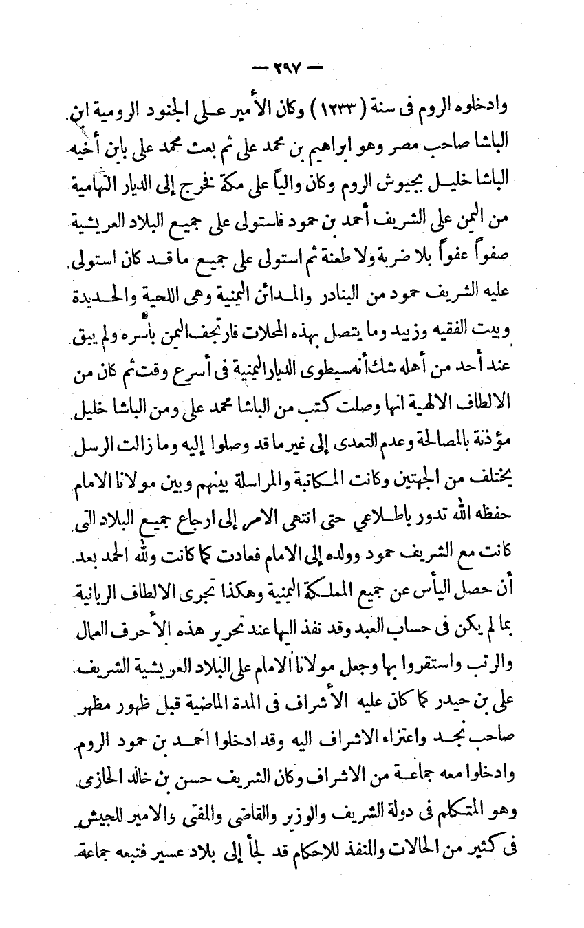 وأدخلوه الروم فِي سنة 1233 وَكَانَ الْأَمِير على الْجنُود الرومية ابْن الباشا صَاحب مصر وَهُوَ إِبْرَاهِيم بن مُحَمَّد علي ثمَّ بعث مُحَمَّد على بِابْن أَخِيه الباشا خَلِيل بجيوش الروم وَكَانَ واليا على مَكَّة فَخرج إِلَى الديار التهامية من الْيمن على الشريف أَحْمد بن حمود فاستولى على جَمِيع الْبِلَاد العريشية صفوا عفوا بِلَا ضَرْبَة وَلَا طعنة ثمَّ استولى على جَمِيع مَا قد كَانَ استولى عَلَيْهِ الشريف حمود من البنادر والمدائن اليمنية وهي اللِّحْيَة والحديدة وَبَيت الْفَقِيه وزبيد وَمَا يتَّصل بِهَذِهِ المحلات فارتجف الْيمن بأسره وَلم يبْق عِنْد أحد من أَهله شك أَنه سيطوي الديار اليمنية فِي أسْرع وَقت ثمَّ كَانَ من الألطاف الإلهية أنها وصلت كتب من الباشا مُحَمَّد علي وَمن الباشا خَلِيل مؤذنة بالمصالحة وَعدم التعدي إِلَى غير مَا قد وصلوا إِلَيْهِ وَمَا زَالَت الرُّسُل يخْتَلف من الْجِهَتَيْنِ وَكَانَت الْمُكَاتبَة والمراسلة بَينهم وَبَين مَوْلَانَا الإِمَام حفظه الله تَدور باطلاعي حَتَّى انْتهى الْأَمر إِلَى إرجاع جَمِيع الْبِلَاد الَّتِى كَانَت مَعَ الشريف حمود وَولده إِلَى الإِمَام فَعَادَت كَمَا كَانَت وَللَّه الْحَمد بعد أَن حصل الْيَأْس عَن جَمِيع المملكة اليمنية وَهَكَذَا تجري الألطاف الربانية بِمَا لم يكن فِي حِسَاب العَبْد وَقد نفذ إِلَيْهَا عِنْد تَحْرِير هَذِه الأحرف الْعمَّال والرتب واستقروا بهَا وَجعل مَوْلَانَا الإِمَام على الْبِلَاد العريشية الشريف علي بن حيدر كَمَا كَانَ عَلَيْهِ الْأَشْرَاف فِي الْمدَّة الْمَاضِيَة قبل ظُهُور مظهر صَاحب نجد واعتزاء الْأَشْرَاف إِلَيْهِ وَقد أدخلُوا احْمَد بن حمود الروم وأدخلوا مَعَه جمَاعَة من الْأَشْرَاف وَكَانَ الشريف حسن بن خَالِد الحازمي وَهُوَ الْمُتَكَلّم فِي دولة الشريف والوزير وَالْقَاضِي والمفتي والأمير للجيش فِي كثير من الْحَالَات والمنفذ للْأَحْكَام قد لَجأ إِلَى بِلَاد عسير فَتَبِعَهُ جمَاعَة