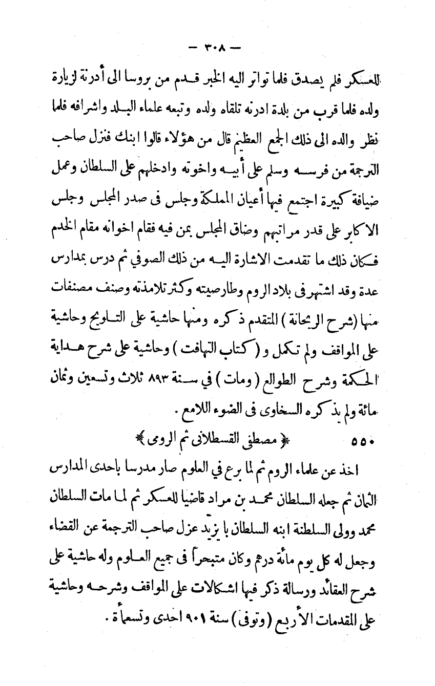 للعسكر فَلم يصدق فَلَمَّا تَوَاتر إِلَيْهِ الْخَبَر قدم من بروسا إِلَى أدرنة لزيارة وَلَده فَلَمَّا قرب من بَلْدَة أدرنة تَلقاهُ وَلَده وَتَبعهُ عُلَمَاء الْبَلَد وأشرافه فَلَمَّا نظر وَالِده إِلَى ذَلِك الْجمع الْعَظِيم قَالَ من هَؤُلَاءِ قَالُوا ابْنك فَنزل صَاحب التَّرْجَمَة من فرسه وَسلم على أَبِيه وأخوته وأدخلهم على السُّلْطَان وَعمل ضِيَافَة كَبِيرَة اجْتمع فِيهَا أَعْيَان المملكة وَجلسَ فِي صدر الْمجْلس وَجلسَ الأكابر على قدر مَرَاتِبهمْ وضاق الْمجْلس بِمن فِيهِ فَقَامَ أخوته مقَام الخدم فَكَانَ ذَلِك مَا تقدمت الْإِشَارَة إِلَيْهِ من ذَلِك الصُّوفِي ثمَّ درس بمدارس عدَّة وَقد اشْتهر فِي بِلَاد الروم وطار صيته وَكثر تلامذته وصنف مصنفات مِنْهَا شرح الريحانة الْمُتَقَدّم ذكره وَمِنْهَا حَاشِيَة على التَّلْوِيح وحاشية على المواقف وَلم تكمل وَكتاب التهافت وحاشية على شرح هِدَايَة الْحِكْمَة وَشرح الطوالع وَمَات فِي سنة 893 ثَلَاث وَتِسْعين وثمان مائَة وَلم يذكرهُ السخاوي فِي الضَّوْء اللامع