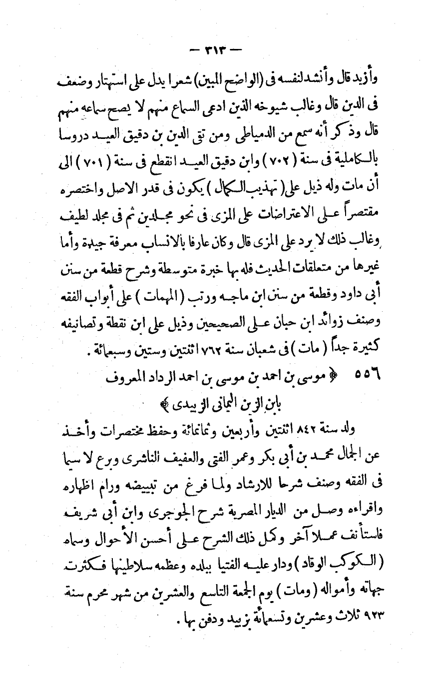 وأزيد قَالَ وَأنْشد لنَفسِهِ فِي الْوَاضِح الْمُبين شعرا يدل على استهتار وَضعف فِي الدَّين قَالَ وغالب شُيُوخه الَّذين ادعى السماع مِنْهُم لَا يَصح سَمَاعه مِنْهُم قَالَ وَذكر أَنه سمع من الدمياطي وَمن تقي الدَّين بن دَقِيق الْعِيد دروسا بالكاملية فِي سنة 702 وَابْن دَقِيق الْعِيد انْقَطع فِي سنة 701 إِلَى أَن مَاتَ وَله ذيل على تَهْذِيب الْكَمَال يكون فِي قدر الأَصْل وَاخْتَصَرَهُ مُقْتَصرا على الاعتراضات على المزي فِي نَحْو مجلدين ثمَّ فِي مُجَلد لطيف وغالب ذَلِك لَا يرد على المزي قَالَ وَكَانَ عَارِفًا بالأنساب معرفَة جَيِّدَة وَأما غَيرهَا من متعلقات الحَدِيث فَلهُ بهَا خبْرَة متوسطة وَشرح قِطْعَة من سنَن أَبى دَاوُد وَقطعَة من سنَن ابْن مَاجَه ورتب الْمُهِمَّات على أَبْوَاب الْفِقْه وصنف زَوَائِد ابْن حبَان على الصَّحِيحَيْنِ وذيل على ابْن نقطة وتصانيفه كَثِيرَة جدا مَاتَ فِي شعْبَان سنة 762 اثْنَتَيْنِ وَسِتِّينَ وَسَبْعمائة مُوسَى بن احْمَد بن مُوسَى بن احْمَد الرداد الْمَعْرُوف بِابْن الزين اليماني الزبيدي