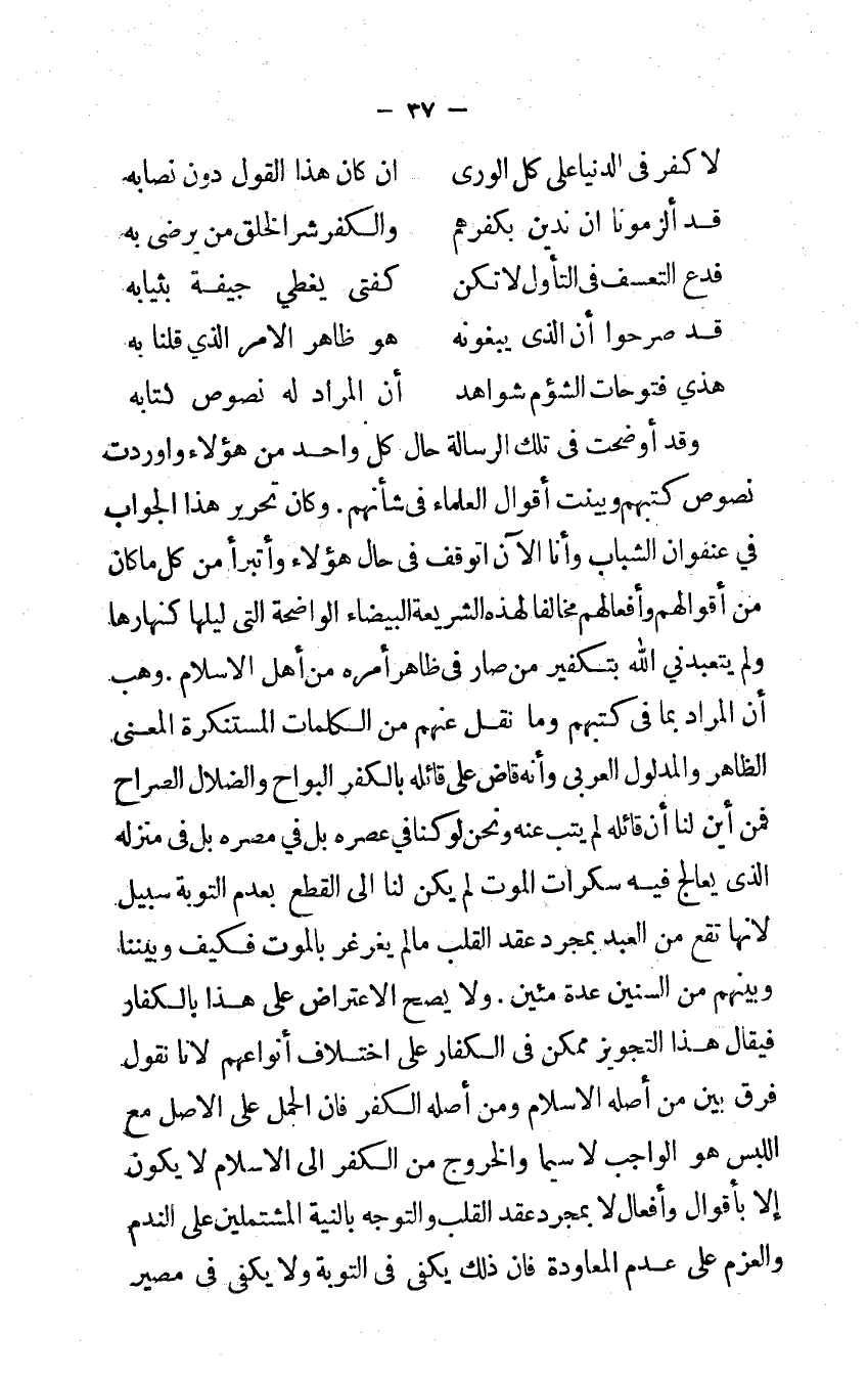 وَكَانَ تَحْرِير هَذَا الْجَواب فِي عنفوان الشَّبَاب وَأَنا الْآن أتوقف في حَال هَؤُلَاءِ وأتبرأ من كل مَا كَانَ من أَقْوَالهم وأفعالهم مُخَالفا لهَذِهِ الشَّرِيعَة الْبَيْضَاء الْوَاضِحَة الَّتِى لَيْلهَا كنهارها وَلم يتعبدني الله بتكفير من صَار في ظَاهر أمره من أهل الْإِسْلَام