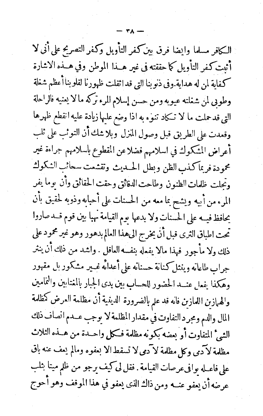الْكَافِر مُسلما وَأَيْضًا فرق بَين كفر التَّأْوِيل وَكفر التَّصْرِيح على أَنى لَا أثبت كفر التَّأْوِيل كَمَا حققته في غير هَذَا الموطن وَفِي هَذِه الْإِشَارَة كِفَايَة لمن لَهُ هِدَايَة وفي ذنوبنا الَّتِى قد اثقلت ظُهُورنَا لقلوبنا أعظم شغلة وطوبى لمن شغلته عيوبه وَمن حسن إِسْلَام الْمَرْء تَركه مَالا يعنيه فالراحلة الَّتِى قد حملت مَالا تكَاد تنوء بِهِ إِذا وضع عَلَيْهَا زِيَادَة عَلَيْهِ انْقَطع ظهرهَا وَقَعَدت على الطَّرِيق قبل وُصُول الْمنزل وَبلا شك أَن التوئب على ثلب أَعْرَاض الْمَشْكُوك فِي إسلامهم فضلاً عَن الْمَقْطُوع بِإِسْلَامِهِمْ جَرَاءَة غير محمودة فَرُبمَا كذب الظَّن وَبَطل الحَدِيث وتقشعت سحائب الشكوك وتجلت ظلمات الظنون وطاحت الدقائق وحقت الْحَقَائِق وَأَن يَوْمًا يفرّ الْمَرْء من أَبِيه ويشح بِمَا مَعَه من الْحَسَنَات على أحبابه وَذَوِيهِ لحقيق بِأَن يحافظ فِيهِ على الْحَسَنَات وَلَا يَدعهَا يَوْم الْقِيَامَة نهباً بَين قوم قد صَارُوا تَحت أطباق الثرى قبل أَن يخرج إِلَى هَذَا الْعَالم بدهور وَهُوَ غير مَحْمُود على ذَلِك وَلَا مأجور فَهَذَا مَالا يَفْعَله بِنَفسِهِ الْعَاقِل