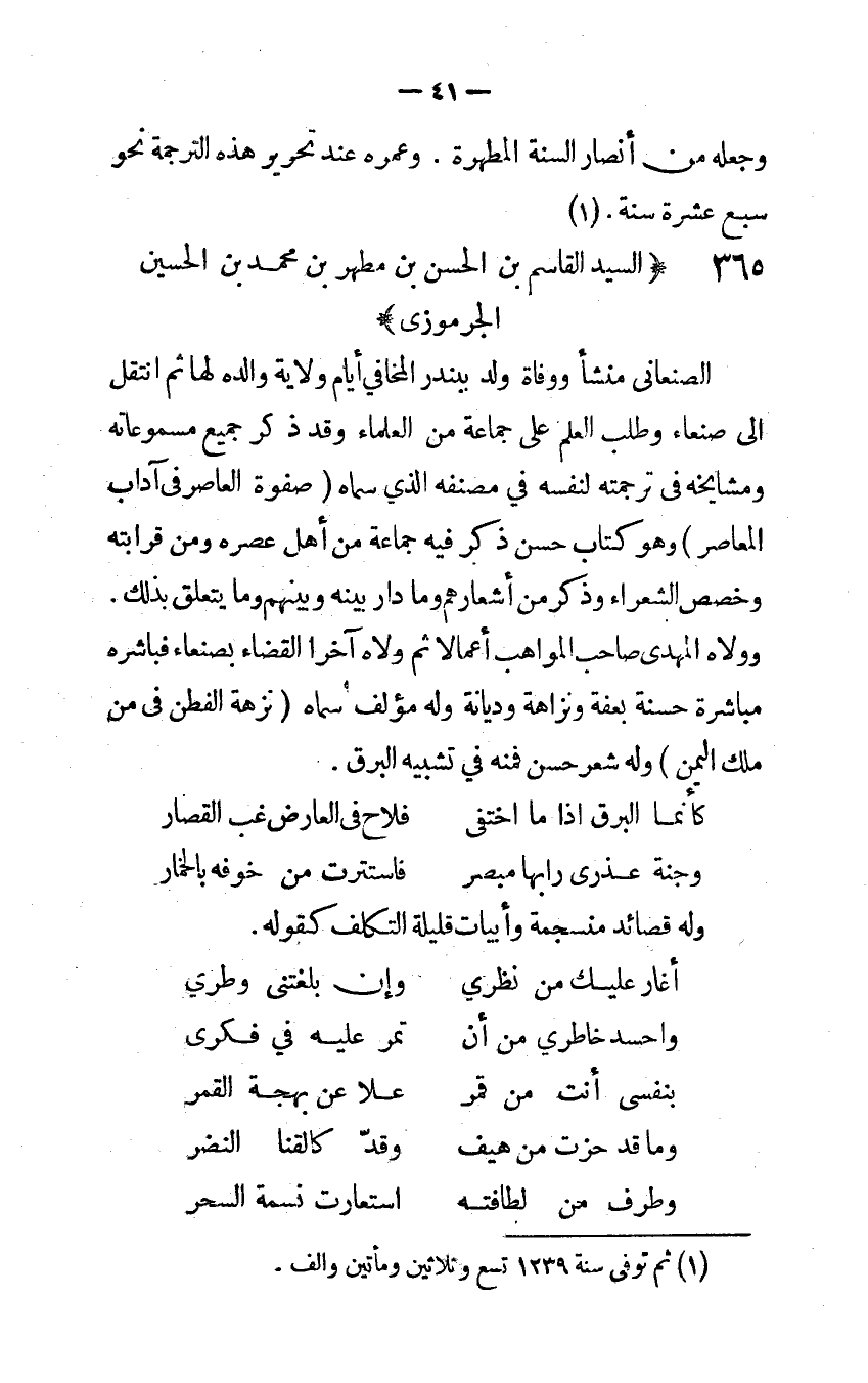 وولاّه المهدي صَاحب الْمَوَاهِب أعمالاً ثمَّ ولاّه آخراً الْقَضَاء بِصَنْعَاء فباشره مُبَاشرَة حَسَنَة بعفة ونزاهة وديانة وَله مؤلف سَمَّاهُ نزهة الفطن في من ملك الْيمن وَله شعر حسن فَمِنْهُ فِي تَشْبِيه الْبَرْق