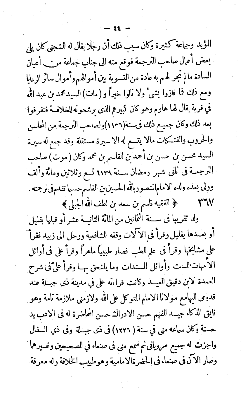الْمُؤَيد وَجَمَاعَة كَثِيرَة وَكَانَ سَبَب ذَلِك أَن رجلاً يُقَال لَهُ الشجني كَانَ يلي بعض أَعمال صَاحب التَّرْجَمَة فَوَقع مِنْهُ إِلَى جناب جمَاعَة من أَعْيَان السَّادة مالم تجر لَهُم بِهِ عَادَة من التَّسْوِيَة بَين أَمْوَالهم وأموال سَائِر الرعايا وَمَعَ ذَلِك فَمَا فازوا بشئ وَلَا نالوا خيراً وَمَات السَّيِّد مُحَمَّد بن عبد الله فِي قَرْيَة يُقَال لَهَا هاوم وَهُوَ كَانَ كَبِيرهمْ الذي يرشحونه للخلافة فَتَفَرَّقُوا بعد ذَلِك وَكَانَ جَمِيع ذَلِك فِي سنة 1136 وَلِصَاحِب التَّرْجَمَة من المحاسن والحروب والفتكات مَالا يَتَّسِع لَهُ إلا سيرة مُسْتَقلَّة وَقد جمع لَهُ سيرة السَّيِّد محسن بن حسن بن أَحْمد بن الْقَاسِم بن مُحَمَّد وَكَانَ موت صَاحب التَّرْجَمَة فِي ثاني شهر رَمَضَان سنة 1139 تسع وَثَلَاثِينَ وَمِائَة وَألف وَولى بعده وَلَده الإِمَام الْمَنْصُور بِاللَّه الْحُسَيْن بن الْقَاسِم حَسْبَمَا تقدّم فِي تَرْجَمته