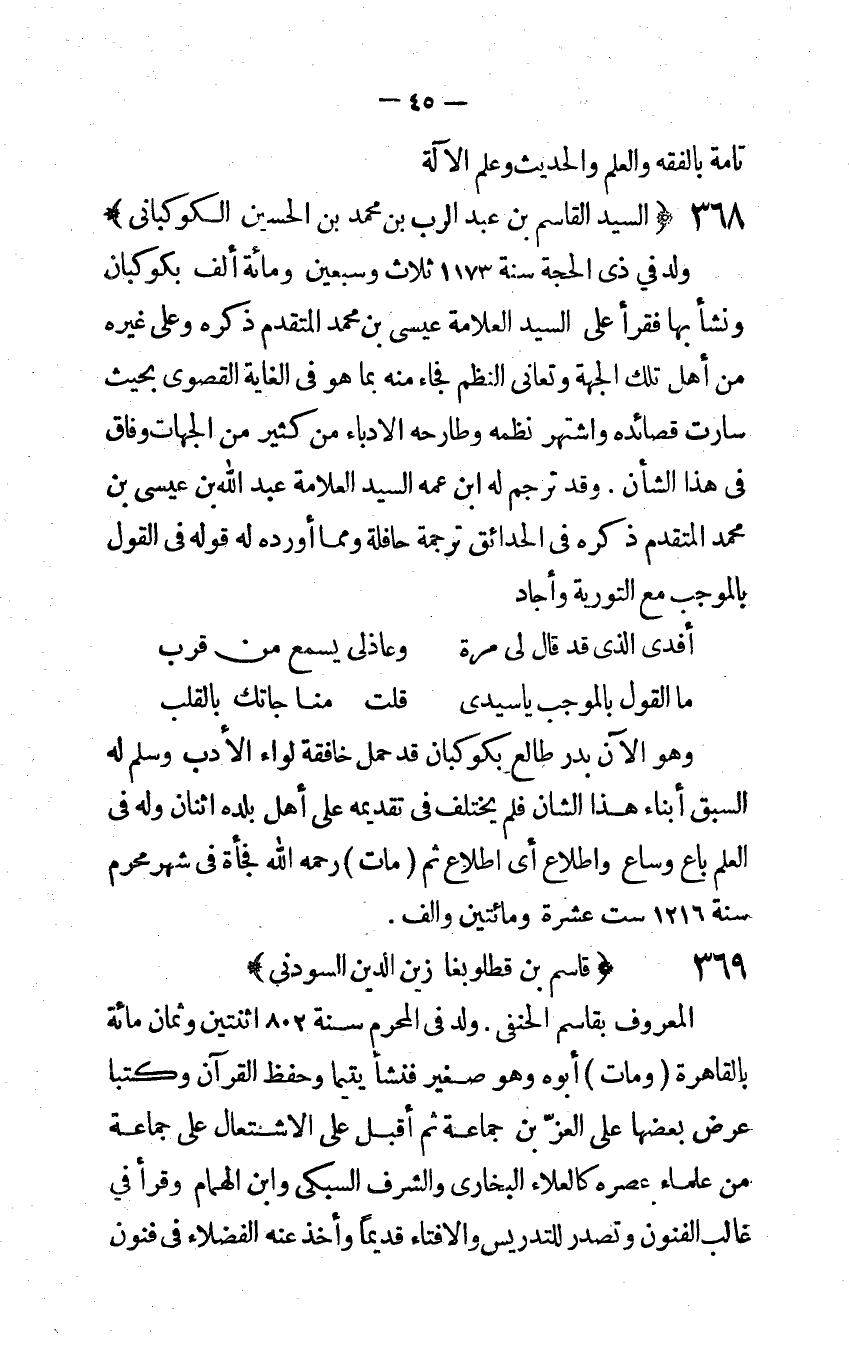 وَهُوَ الْآن بدر طالع بكوكبان قد حمل خافقة لِوَاء الْأَدَب وَسلم لَهُ السَّبق أَبنَاء هَذَا الشَّأْن فَلم يخْتَلف في تَقْدِيمه على أهل بَلَده اثْنَان وَله في الْعلم بَاعَ وساع واطلاع أى اطلَاع ثمَّ مَاتَ رَحمَه الله فَجْأَة في شهر محرم سنة 1216 سِتّ عشرَة وَمِائَتَيْنِ وَألف