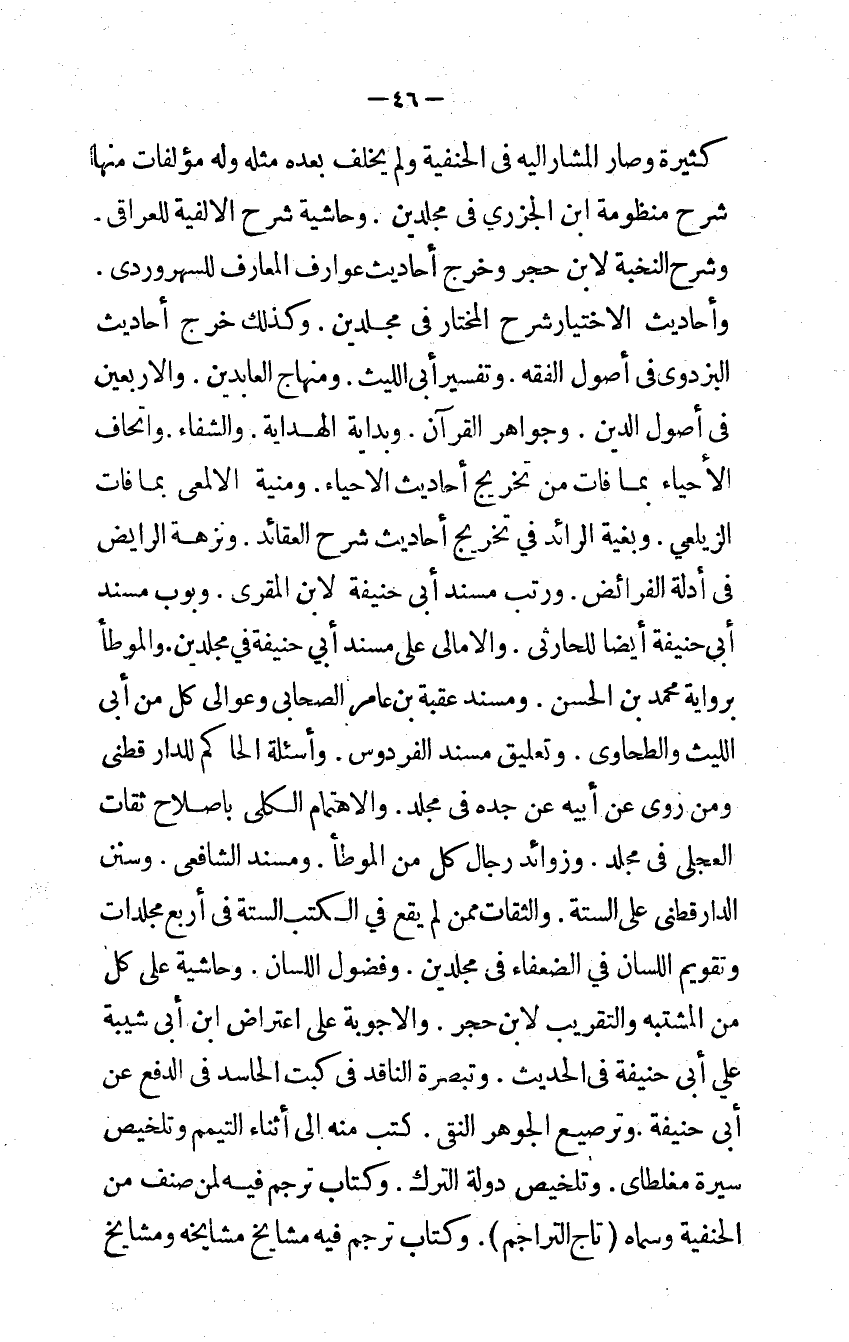 وَتَفْسِير أَبى اللَّيْث ومنهاج العابدين وَالْأَرْبَعِينَ فِي أصُول الدَّين وجواهر الْقُرْآن وبداية الْهِدَايَة والشفاء وإتحاف الْأَحْيَاء بِمَا فَاتَ من تَخْرِيج احاديث الْأَحْيَاء ومنية الألمعى بِمَا فَاتَ الزَّيْلَعِيّ وبغية الرائد فى تَخْرِيج أَحَادِيث شرح العقائد ونزهة الرايض في أَدِلَّة الْفَرَائِض ورتب مُسْند أَبى حنيفَة لِابْنِ المقري وَبَوَّبَ مُسْند أَبى حنيفَة أَيْضا للحارثي والأمالي على مُسْند أبي حنيفَة فِي مجلدين والموطأ بِرِوَايَة مُحَمَّد بن الْحسن ومسند عقبَة بن عَامر الصحابي وعوالي كل من أَبى اللَّيْث والطحاوي وَتَعْلِيق مُسْند الفردوس وأسئلة الْحَاكِم للدارقطنى وَمن روى عَن أَبِيه عَن جده في مُجَلد والاهتمام الكلي بإصلاح ثِقَات العجلي في مُجَلد وزوائد رجال كل من الْمُوَطَّأ ومسند الشافعى وَسنَن الدارقطنى على السِّتَّة والثقات مِمَّن لم يَقع فِي الْكتب السِّتَّة في أَربع مجلدات وتقويم اللِّسَان فِي الضُّعَفَاء فِي مجلدين وفضول اللِّسَان وحاشية على كل من المشتبه والتقريب لِابْنِ حجر والأجوبة على اعْتِرَاض ابْن أَبى شيبَة عَليّ أَبى حنيفَة في الحَدِيث وتبصرة النَّاقِد فى كبت الْحَاسِد في الدفع عَن أَبى حنيفَة وترصيع الْجَوْهَر النقي كتب مِنْهُ إِلَى أثْنَاء التَّيَمُّم وتلخيص سيرة مغلطاي وتلخيص دولة التّرْك وَكتاب ترْجم فِيهِ لمن صنف من الْحَنَفِيَّة وَسَماهُ تَاج التراجم وَكتاب ترْجم فِيهِ مَشَايِخ مشايخه ومشايخ