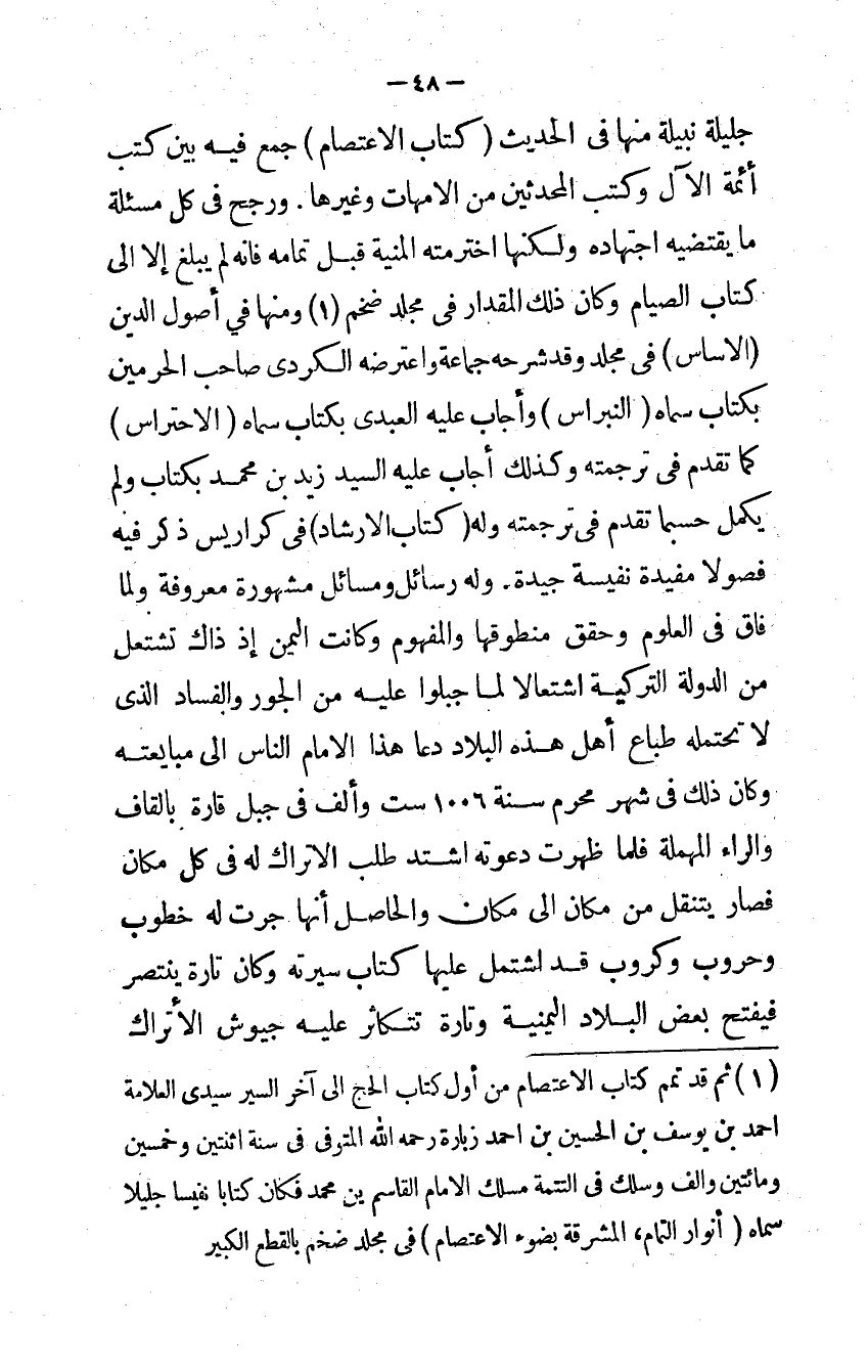جليلة نبيلة مِنْهَا في الحَدِيث كتاب الِاعْتِصَام جمع فِيهِ بَين كتب أَئِمَّة الْآل وَكتب الْمُحدثين من الْأُمَّهَات وَغَيرهَا وَرجح فى كل مسئلة مَا يَقْتَضِيهِ وَلكنهَا اخترمته الْمنية قبل تَمَامه فَإِنَّهُ لم يبلغ إِلَّا إِلَى كتاب الصيام وَكَانَ ذَلِك الْمِقْدَار في مُجَلد ضخم وَمِنْهَا فِي أصُول الدَّين الأساس في مُجَلد وَقد شَرحه جمَاعَة وَاعْتَرضهُ الكردي صَاحب الْحَرَمَيْنِ بِكِتَاب سَمَّاهُ النبراس وَأجَاب عَلَيْهِ العبدي بِكِتَاب سَمَّاهُ الاحتراس كَمَا تقدم في تَرْجَمته وَكَذَلِكَ أجَاب عَلَيْهِ السَّيِّد زيد بن مُحَمَّد بِكِتَاب وَلم يكمل حَسْبَمَا تقدم في تَرْجَمته وَله كتاب الإرشاد في كراريس ذكر فِيهِ فصولاً مفيدة نفيسة جَيِّدَة وَله رسائل ومسائل مَشْهُورَة مَعْرُوفَة وَلما فاق في الْعُلُوم وحقق منطوقها وَالْمَفْهُوم وَكَانَت الْيمن إِذْ ذَاك تشتعل من الدولة التركية اشتعالا لما جبلوا عَلَيْهِ من الْجور وَالْفساد الذي لَا تحتمله طباع أهل هَذِه الْبِلَاد دَعَا هَذَا الإِمَام النَّاس إِلَى مبايعته وَكَانَ ذَلِك في شهر محرم سنة 1006 سِتّ وَألف في جبل قارة بِالْقَافِ وَالرَّاء الْمُهْملَة فَلَمَّا ظَهرت دَعوته اشْتَدَّ طلب الأتراك لَهُ في كل مَكَان فَصَارَ يتنقل من مَكَان إِلَى مَكَان وَالْحَاصِل أَنَّهَا جرت لَهُ خطوب وحروب وكروب قد اشْتَمَل عَلَيْهَا كتاب سيرته وَكَانَ تَارَة ينتصر فَيفتح بعض الْبِلَاد اليمنية وَتارَة تتكاثر عَلَيْهِ جيوش الأتراك