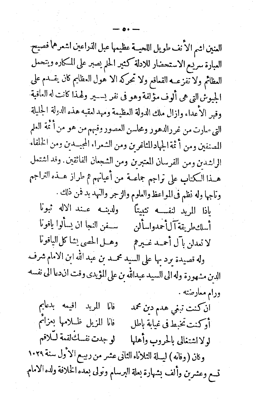 الْعنين أشم الْأنف طَوِيل اللِّحْيَة عظيمها عبل الذراعين أشعرهما فصيح الْعبارَة سريع الاستحضار للأدلة كثير الْحلم يصبر على المكاره ويتحمل العظائم وَلَا تفزعه القعاقع وَلَا تحركه إلا هول العظايم كَانَ يقدم على الجيوش الَّتِى هي أُلُوف مؤلفة وَهُوَ في نفر يسير وَلِهَذَا كَانَت لَهُ الْعَاقِبَة وقهر الْأَعْدَاء وأزال ملك الدولة الْعَظِيمَة ومهد لعقبة هَذِه الدولة الجليلة الَّتِى صَارَت من غرر الدهور ومحاسن العصور وَفِيهِمْ من هُوَ من أَئِمَّة الْعلم المصنفين وَمن أَئِمَّة الْجِهَاد المثاغرين وَمن الشُّعَرَاء المجيدين وَمن الْخُلَفَاء الرَّاشِدين وَمن الفرسان المعتبرين وَمن الشجعان الفائقين