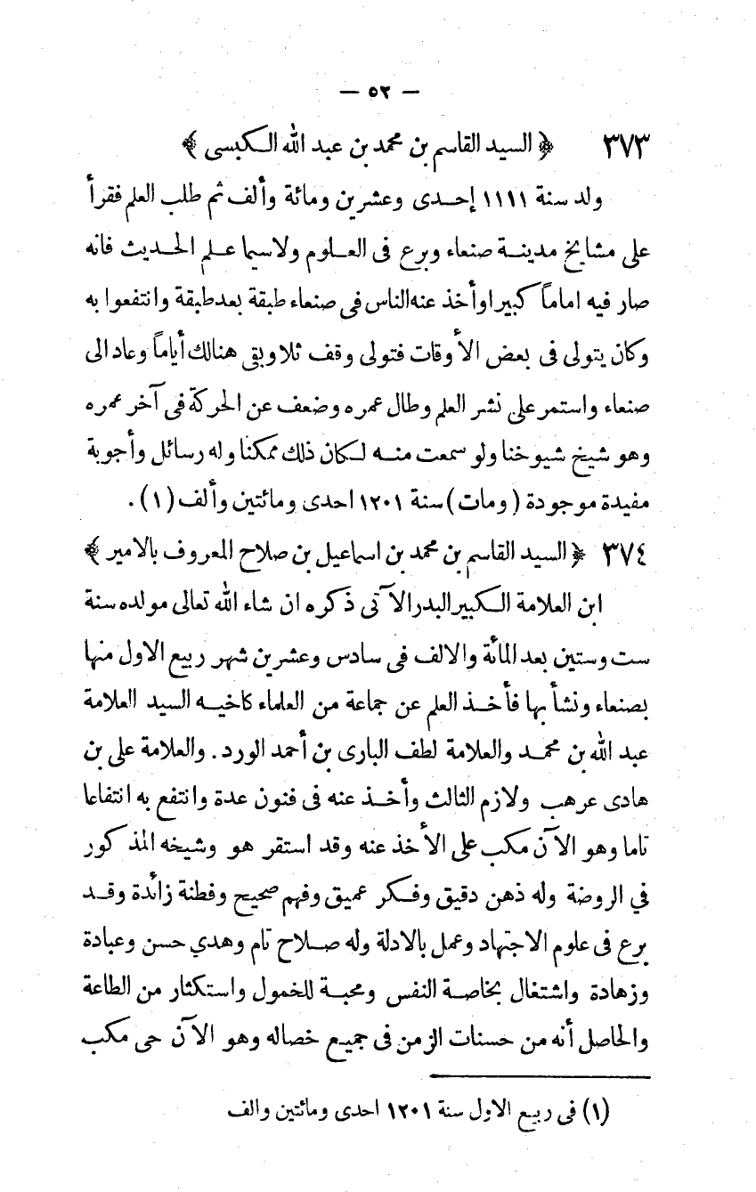 ولد سنة 1121 إِحْدَى وَعشْرين وَمِائَة وَألف ثمَّ طلب الْعلم فَقَرَأَ على مَشَايِخ مَدِينَة صنعاء وبرع في الْعُلُوم ولاسيما علم الحَدِيث فَإِنَّهُ صَار فِيهِ إماماً كَبِيرا وَأخذ عَنهُ النَّاس في صنعاء طبقَة بعد طبقَة وانتفعوا بِهِ وَكَانَ يتَوَلَّى في بعض الْأَوْقَات فَتَوَلّى وقف ثلا وبقى هُنَالك أَيَّامًا وَعَاد إِلَى صنعاء وَاسْتمرّ على نشر الْعلم وَطَالَ عمره وَضعف عَن الْحَرَكَة في آخر عمره وَهُوَ شيخ شُيُوخنَا وَلَو سَمِعت مِنْهُ لَكَانَ ذَلِك مُمكنا وَله رسائل وأجوبة مفيدة مَوْجُودَة وَمَات سنة 1201 إحدى وَمِائَتَيْنِ وَألف