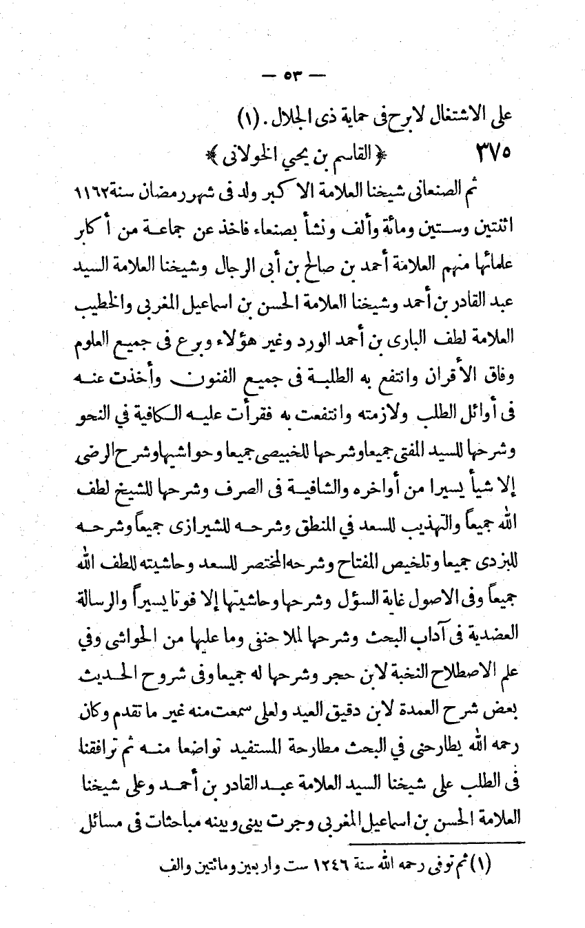 ثمَّ الصنعاني شَيخنَا الْعَلامَة الْأَكْبَر ولد في شهر رَمَضَان سنة 1162 اثْنَتَيْنِ وَسِتِّينَ وَمِائَة وَألف وَنَشَأ بِصَنْعَاء فَأخذ عَن جمَاعَة من أكَابِر علمائها مِنْهُم الْعَلامَة أَحْمد بن صَالح بن أَبى الرِّجَال وَشَيخنَا الْعَلامَة السَّيِّد عبد الْقَادِر بن أَحْمد وَشَيخنَا الْعَلامَة الْحسن بن إِسْمَاعِيل المغربي والخطيب الْعَلامَة لطف الباري بن أَحْمد الْورْد وَغير هَؤُلَاءِ وبرع في جَمِيع الْعُلُوم وفَاق الأقران وانتفع بِهِ الطّلبَة في جَمِيع الْفُنُون وَأخذت عَنهُ في أَوَائِل الطلب ولازمته وانتفعت بِهِ فَقَرَأت عَلَيْهِ الكافية فِي النَّحْو وَشَرحهَا للسَّيِّد الْمُفْتى جَمِيعًا وَشَرحهَا للخبيصي جَمِيعًا وحواشيها وَشرح الرضى إِلَّا شيأ يَسِيرا من أواخره والشافية في الصّرْف وَشَرحهَا للشَّيْخ لطف الله جَمِيعًا والتهذيب للسعد فِي الْمنطق وَشَرحه للشيرازي جَمِيعًا وَشَرحه للبزدى جَمِيعًا وتلخيص الْمِفْتَاح وحاشيته للطف الله جَمِيعًا وفي الْأُصُول غَايَة السؤل وَشَرحهَا وحاشيتها إِلَّا فوتا يَسِيرا والرسالة العضدية فى آدَاب الْبَحْث وَشَرحهَا لملا حنفى وَمَا عَلَيْهَا من الحواشى وفى علم الِاصْطِلَاح النخبة لِابْنِ حجر وَشَرحهَا لَهُ جَمِيعًا وفي شُرُوح الحَدِيث بعض شرح الْعُمْدَة لِابْنِ دَقِيق الْعِيد ولعلى سَمِعت مِنْهُ غير مَا تقدم وَكَانَ رَحمَه الله يطارحني فِي الْبَحْث مطارحة المستفيد تواضعاً مِنْهُ ثمَّ ترافقنا في الطلب على شَيخنَا السَّيِّد الْعَلامَة عبد الْقَادِر بن أَحْمد وعَلى شَيخنَا الْعَلامَة الْحسن بن إِسْمَاعِيل المغربي وَجَرت بيني وَبَينه مباحثات في مسَائِل