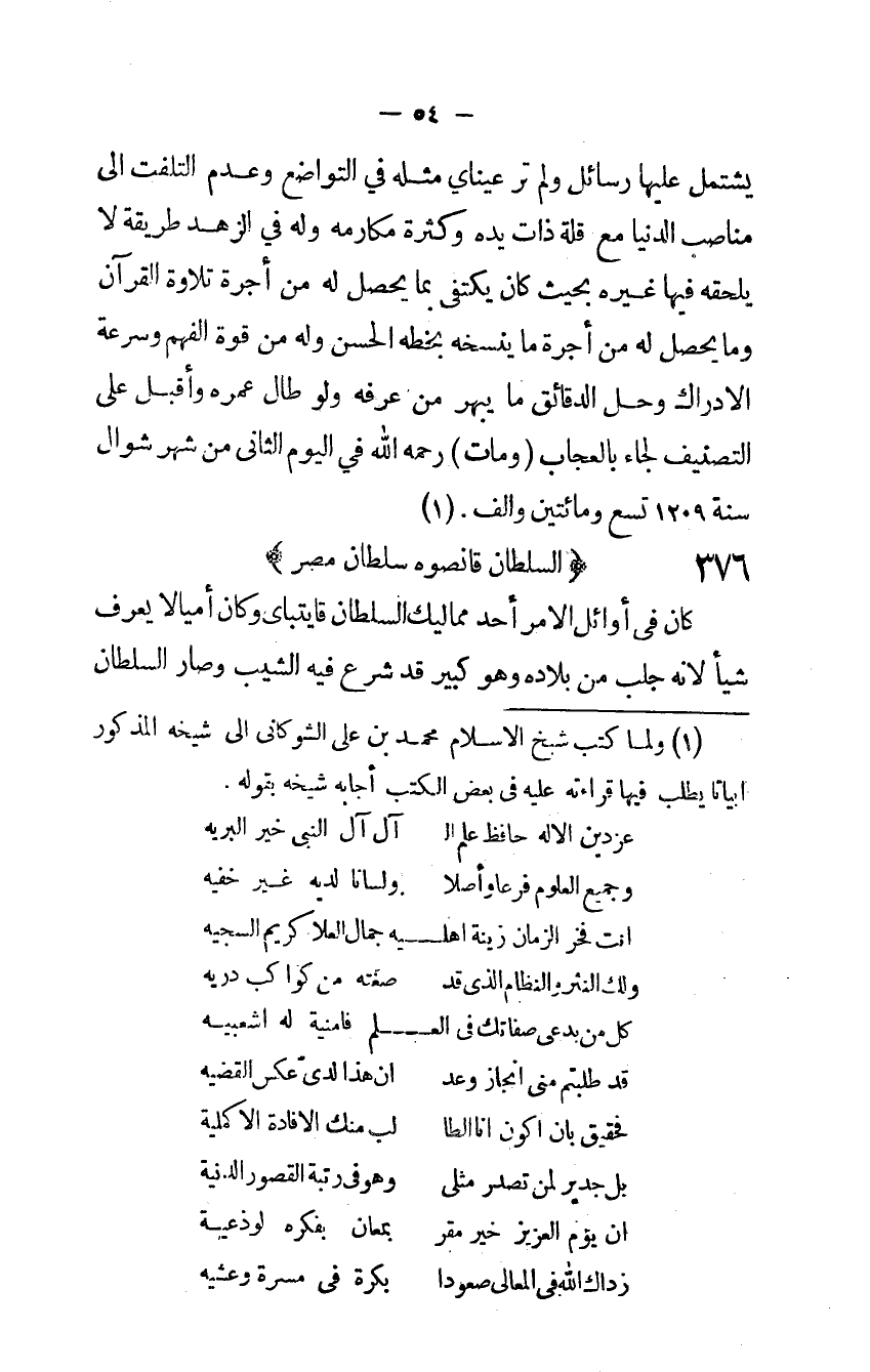 يشْتَمل عَلَيْهَا رسائل وَلم تَرَ عَيْنَايَ مثله فِي التَّوَاضُع وَعدم التلفت إِلَى مناصب الدُّنْيَا مَعَ قلَّة ذَات يَده وَكَثْرَة مكارمه وَله فِي الزّهْد طَريقَة لَا يلْحقهُ فِيهَا غَيره بِحَيْثُ كَانَ يكْتَفى بِمَا يحصل لَهُ من أُجْرَة تِلَاوَة الْقُرْآن وَمَا يحصل لَهُ من أُجْرَة مَا ينسخه بِخَطِّهِ الْحسن وَله من قُوَّة الْفَهم وَسُرْعَة الْإِدْرَاك وَحل الدقائق مَا يبهر من عرفه وَلَو طَال عمره وَأَقْبل عليّ التصنيف لجاء بالعجاب وَمَات رَحمَه الله فِي الْيَوْم الثاني من شهر شَوَّال سنة 1209 تسع وَمِائَتَيْنِ وَألف