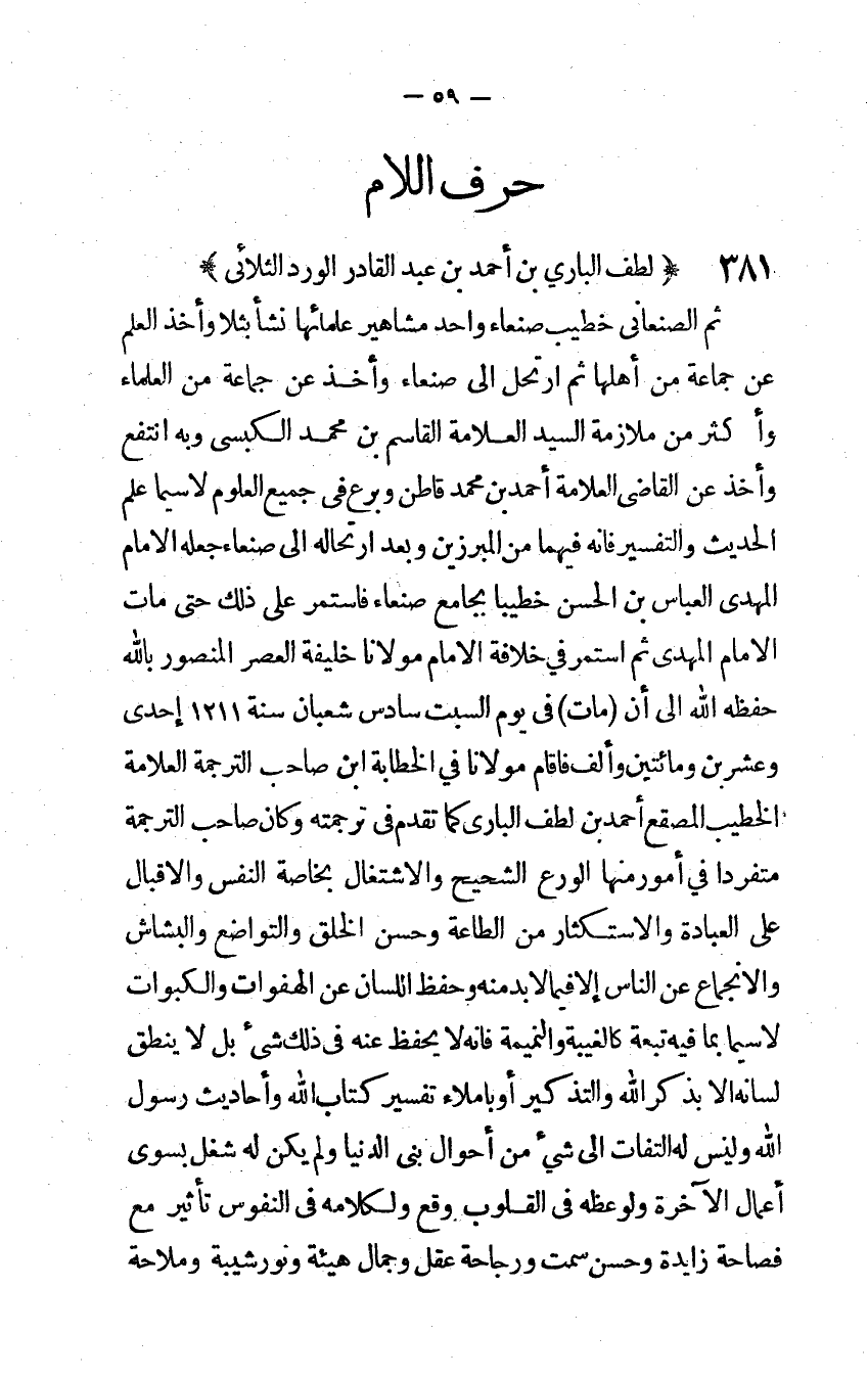 ثمَّ الصنعاني خطيب صنعاء وَاحِد مشاهير علمائها نَشأ بثلا وَأخذ الْعلم عَن جمَاعَة من أَهلهَا ثمَّ ارتحل إِلَى صنعاء وَأخذ عَن جمَاعَة من الْعلمَاء وَأكْثر من مُلَازمَة السَّيِّد الْعَلامَة الْقَاسِم بن مُحَمَّد الكبسي وَبِه انْتفع وَأخذ عَن القاضي الْعَلامَة أَحْمد بن مُحَمَّد قاطن وبرع في جَمِيع الْعُلُوم لَا سِيمَا علم الحَدِيث وَالتَّفْسِير فإنه فيهمَا من المبرزين وَبعد ارتحاله إِلَى صنعاء جعله الإِمَام المهدي الْعَبَّاس بن الْحسن خَطِيبًا بِجَامِع صنعاء فاستمر على ذَلِك حَتَّى مَاتَ الإِمَام المهدي ثمَّ اسْتمرّ فِي خلَافَة الإِمَام مَوْلَانَا خَليفَة الْعَصْر الْمَنْصُور بِاللَّه خفظه الله إِلَى أَن مَاتَ في يَوْم السبت سادس شعْبَان سنة 1211 إِحْدَى وَعشْرين وَمِائَتَيْنِ وَألف فأقام مَوْلَانَا في الخطابة ابْن صَاحب التَّرْجَمَة الْعَلامَة الْخَطِيب المصقع أَحْمد بن لطف الْبَارِي كَمَا تقدم فِي تَرْجَمته وَكَانَ صَاحب التَّرْجَمَة متفرداً فِي أُمُور مِنْهَا الْوَرع الشحيح والاشتغال بِخَاصَّة النَّفس والإقبال على الْعِبَادَة والاستكثار من الطَّاعَة وَحسن الْخلق والتواضع والبشاش والانجماع عَن النَّاس إِلَّا فِيمَا لَا بُد مِنْهُ وَحفظ اللِّسَان عَن الهفوات والكبوات لاسيما بِمَا فِيهِ تبعه كالغيبة والنميمة فَإِنَّهُ لَا يحفظ عَنهُ فى ذَلِك شئ بل لَا ينْطق لِسَانه إلا بِذكر الله والتذكير أَو بإملاء تَفْسِير كتاب الله وَأَحَادِيث رَسُول الله وَلَيْسَ لَهُ الْتِفَات إِلَى شَيْء من أَحْوَال بني الدُّنْيَا وَلم يكن لَهُ شغل بسوى أَعمال الْآخِرَة ولوعظه في الْقُلُوب وَقع ولكلامه في النُّفُوس تَأْثِير مَعَ فصاحة زايدة وَحسن سمت ورجاحة عقل وجمال هَيْئَة وَنور شيبَة وملاحة