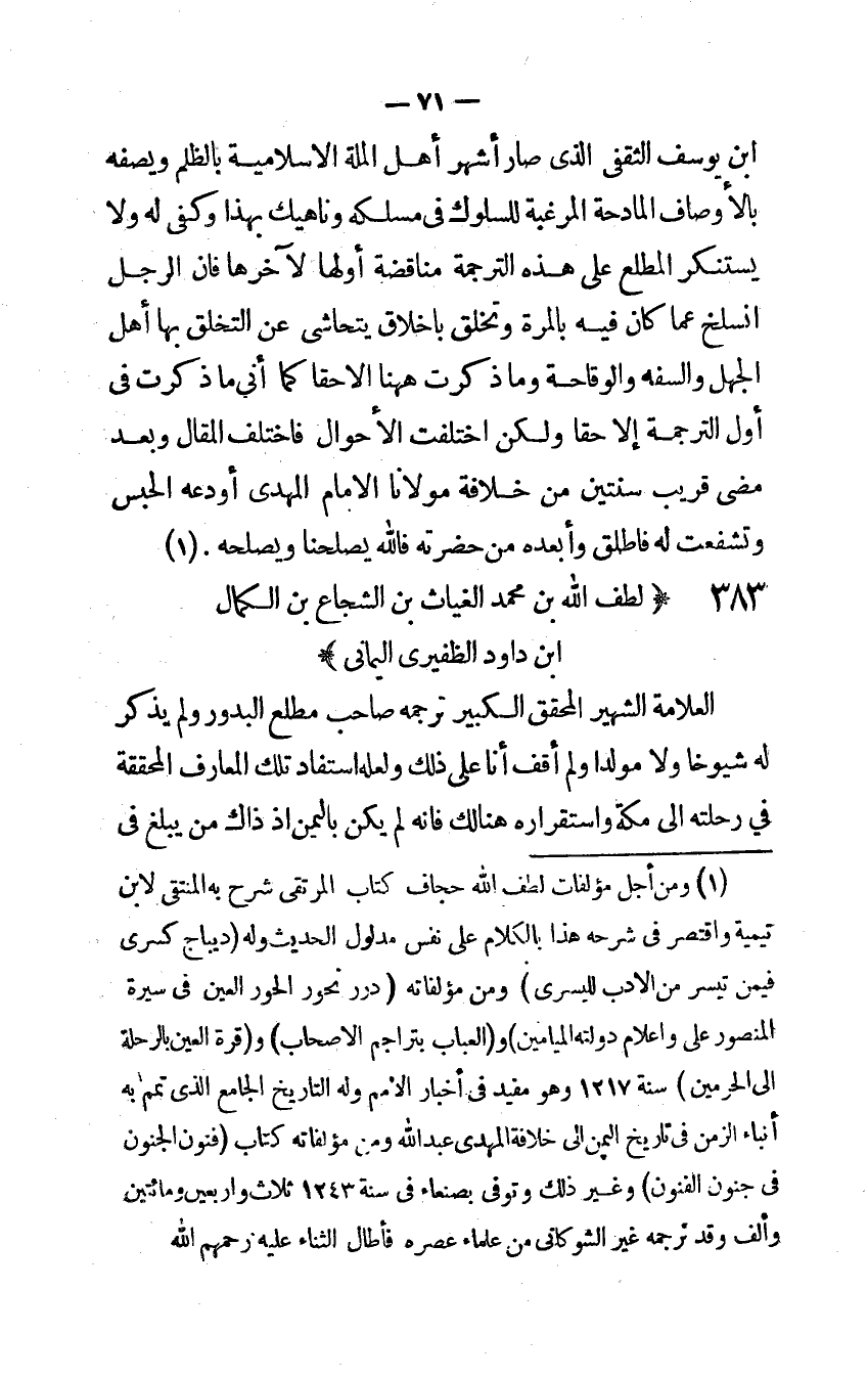 الْعَلامَة الشهير الْمُحَقق الْكَبِير تَرْجمهُ صَاحب مطلع البدور وَلم يذكر لَهُ شُيُوخًا وَلَا مولدا وَلم أَقف أَنا على ذَلِك وَلَعَلَّه اسْتَفَادَ تِلْكَ المعارف المحققة فِي رحلته إِلَى مَكَّة واستقراره هُنَالك فَإِنَّهُ لم يكن بِالْيمن إذ ذَاك من يبلغ في