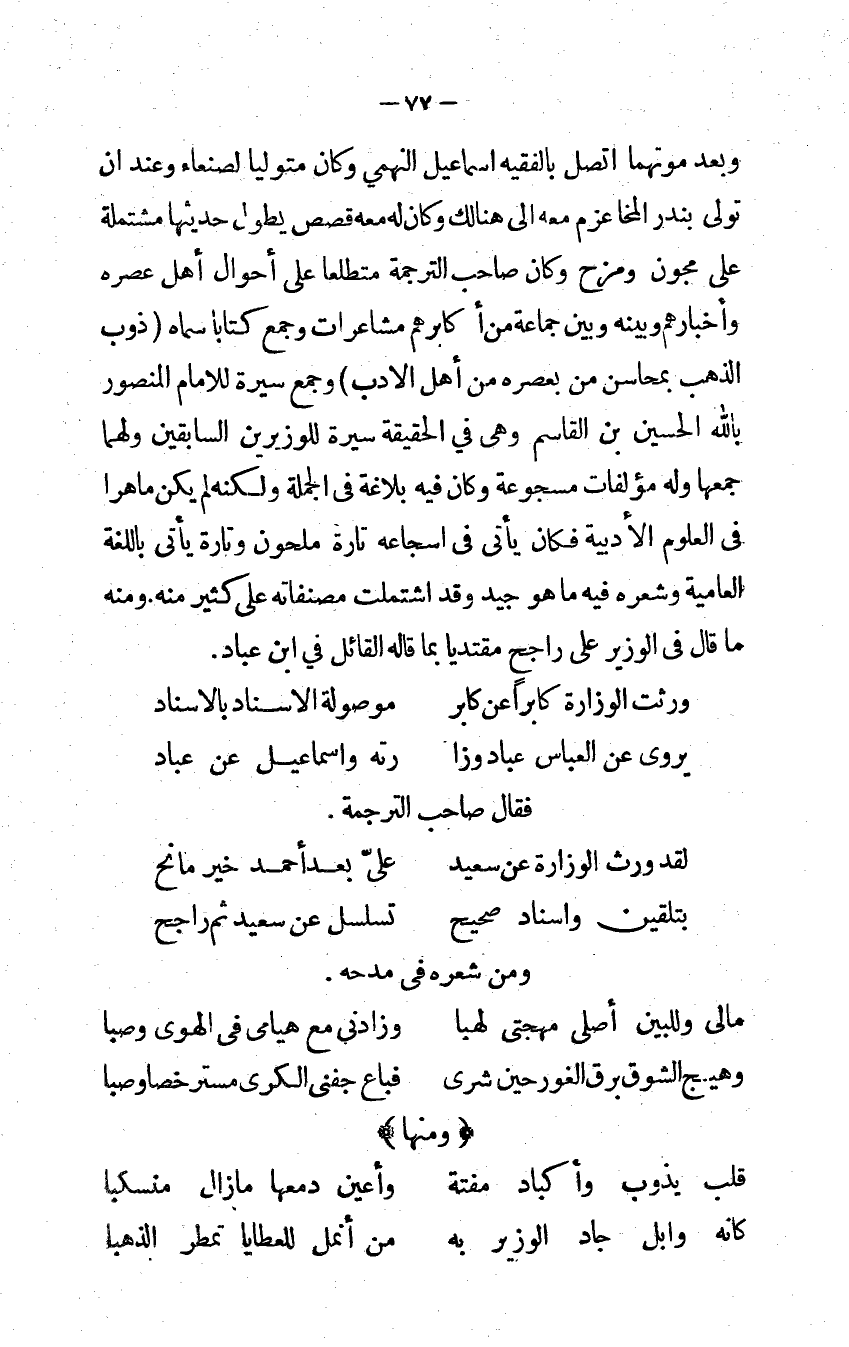 وَبعد مَوْتهمَا اتَّصل بالفقيه إِسْمَاعِيل النهمي وَكَانَ مُتَوَلِّيًا لصنعاء وَعند إن تولى بندر المخا عزم مَعَه إِلَى هُنَالك وَكَانَ لَهُ مَعَه قصَص يطول حَدِيثهَا مُشْتَمِلَة على مجون ومزح وَكَانَ صَاحب التَّرْجَمَة متطلعاً على أَحْوَال أهل عصره وأخبارهم وَبَينه وَبَين جمَاعَة من أكابرهم مشاعرات وَجمع كتابا سَمَّاهُ ذوب الذَّهَب بمحاسن من بعصره من أهل الْأَدَب وَجمع سيرة للْإِمَام الْمَنْصُور بِاللَّه الْحُسَيْن بن الْقَاسِم وهي فِي الْحَقِيقَة سيرة للوزيرين السَّابِقين وَلَهُمَا جمعهَا وَله مؤلفات مسجوعة وَكَانَ فِيهِ بلاغة في الْجُمْلَة وَلكنه لم يكن ماهرا في الْعُلُوم الأدبية فَكَانَ يأتي في اسجاعه تَارَة ملحون وَتارَة يأتي باللغة العامية وشعره فِيهِ مَا هُوَ جيد وَقد اشْتَمَلت مصنفاته على كثير مِنْهُ